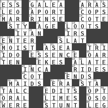 ACROSS 1. Double-curved letter 4. An organ shaped like a helmet 9. Ancient river in northeast Turkey 13. Lion 14. To the left, to Queeg 15. 911 reaches them 16. Impair 17. Wash lightly 18. ____ d'Azur (French Riviera) 19. Filthy place 21. Ripen 22. Plunders 24. "Terrible" tsar 26. Big collection agency 27. Keyboard key 29. Narrow board 30. Wet 31. At sea 33. Three (prefix) 36. Wedding promise 37. Center 40. Rowing implement 41. Nine, plus one 42. Makes supply last 43. Having winglike extensions 45. South American Indian 47. Amusement-park features 48. Small bed 49. Conclusions 50. Unmarried girls 52. Period 54. R.R. building 56. Baby powder 57. Prepares for publication 59. Choose 61. Spoken 62. Citrus fruits 63. Bear (Spanish) 64. We are 65. Difficult or unusual or dangerous feat 66. Part of a journey DOWN 1. Shade tree 2. Oceans 3. Making a chance decision by using lots 4. Slender fish 5. Bee-related 6. Yearn 7. Celtic language 8. Had dinner 9. Buttonhole 10. Carrot, for example 11. Flats, for short 12. Compass dir. 20. Jacques Cousteau's middle name 22. Pale purple color 23. Mouth or opening 25. Johnson of "Laugh-In" 27. Give off 28. Connecting point 29. Elected reps. 31. "____ silly question..." 32. Observe 33. Inedible or poisonous agaric 34. Assign a rank or rating to 35. Angers 38. Religious groups 39. Merit 44. Flaplike coverings 45. Ice on the eave 46. Allow head to fall sleepily 49. Consumed 50. Female horse 51. Having or resembling wings 52. Prepare for publication 53. Tall New Zealand timber tree 55. Domed church section 56. Pull behind 57. Raised railways 58. Fast jet (abbr.) 60. Coat; cloak