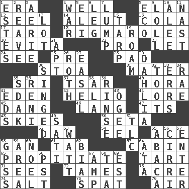 ACROSS 1. Epoch 4. Not ill 8. Flair 12. Sew up the eyelids of hawks and falcons 14. Eskimo relative 16. Root beer relative 17. Edible starchy tuberous root 18. Frustrating wastes of time 20. Webber/Rice musical 22. Adept person 23. Allow 24. Observe 25. Before (prefix) 28. Writing tablet 30. Portico 31. Mother 35. Indian title of respect (Mr.) 37. Russian ruler of old 40. Israeli folk dance 41. Locale of original sin 42. Sun: prefix 44. Old wives' tales, e.g. 45. Mild oath, euphamism for damn 46. Long (Scottish) 47. It is 48. Atmospheres 50. Bristle 52. Simpleton 54. Snakelike fish 55. Adept person 58. Separate the seeds from cotton 61. Bar bill 63. Apartment or room in a ship 65. Conciliate 70. Small pie 71. Observes 72. Softens 73. Land measure 74. Table seasoning 75. Argument over a trivial matter 76. Atmosphere DOWN 1. _____ Park, CO 2. Rob, plunder, or pillage 3. Nest on high 4. Armed conflict 5. Connecticut Ivy Leaguer 6. Part of a journey 7. Mass 8. Environmental prefix 9. Hang loosely or laxly 10. Toward shelter 11. Political cartoonist Thomas 13. Car dealer's back yard 15. Canvas cover 19. Wander aimlessly 21. Fitting 26. Writer of Portnoy's Complaint (1969) 27. Artist's stand 29. Mexican or Central American flower 30. Burned superficially 32. A blast of a horn 33. Blunders 34. Actress Charlotte 35. Neighbor of Neb. 36. Painter Guido (1575-1642) 38. Wing 39. Wash lightly 41. Begley and Asner 43. Double curve, resembling the letter S 49. Suttee (variant) 51. Affectionate concern, for short 53. Electrical Unit 55. Phillipine bananalike plant 56. High-altitude cloud 57. Keyboard key 58. Global Positioning Systems (abbr.) 59. Length times width 60. Christmas carol 62. Prejudice 64. "One Day ___ Time" 66. Pacific Standard Time (abbr.) 67. Electrical Unit 68. Beverage made from leaves 69. Eastern Standard Time (abbr.)