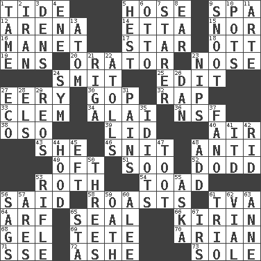 ACROSS 1. Event that recurs at intervals 5. Stockings 9. Health resort 12. Sports stadium 14. Singer James 15. Or not 16. French painter Edouard 17. Play the lead 18. Baseball player Mel 19. Followers of ems 20. Speaker 23. Characteristic smell of wine 24. Stricken, poetically 25. Prepare for publication 27. Suggestive of the supernatural 30. Republican Party 32. Hit sharply and swiftly 33. To starve (Brit.) 34. Jai _ 36. Science/research agcy. 38. Bear (Spanish) 39. Hat (slang) 40. Atmosphere 43. A female animal or person 46. In a ____ (agitated or irritated) 48. Against 49. Often (poetically) 51. "Barney Miller" actor Jack 52. Texas town _ City 53. Writer of Portnoy's Complaint (1969) 54. Frog relative 56. Alleged 58. Exposes to great heat 61. Federal power corp. 64. Sandy's bark 65. Lick closed 66. Japanese brewing company 68. Set 69. Wig 70. Believer in; advocate of (suffix) 71. Compass dir. 72. American tennis player Robert 73. Not divided or shared with others DOWN 1. Docile 2. SW Asia republic 3. Lairs 4. Compass dir. 5. Behest 6. Von Bismarck 7. A viewer who gazes fixedly 8. Hearing organ 9. Snout, nose 10. Cooking vessels 11. Johnson of "Laugh-In" 13. Tiny particle 21. Port city in Latvia 22. Ringlike coral islands and reefs 23. Cuts off 24. Symbol (abbr.) 26. One of the 12 tribes of Israel 27. Environmental prefix 28. Raised railways 29. Vintage cars 31. Aches 35. Foolish or stupid persons 37. Papal veil 41. It would 42. To free from 44. Parka part 45. Newt 47. A blast of a horn 48. Say or write further 50. Triplets 53. Firearm 55. "____ silly question..." 56. Settles 57. Ancient Greek god of war 59. Pledge 60. Toward shelter 61. Musical group of three 62. Small bottle 63. Singer Murray 65. R.R. building 67. Big collection agency