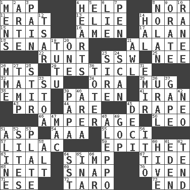 ACROSS 1. Atlas unit 4. Assist 8. And not 11. Part of Q.E.F. 13. Writer Wiesel 14. Israeli folk dance 15. Nuclear Threat Initiatives 16. So be it 17. Actor Alda or Thicke 18. Elected representative 21. Having winglike extensions 22. Undersized animal 23. Compass dir. 25. Born 26. Mountains (abbr.) 29. A testis 32. Taiwanese island in East China Sea 34. Mouth or opening 35. Large cup 38. Send forth 39. Eucharist need 41. SW Asia republic 43. Adept person 44. "We ___ not amused" (Victoria) 45. Window treatment 46. Electrical Measurement 50. Lion 51. Viper 54. Auto club (abbr.) 55. Event scenes 57. Pale purple color 59. Curse 63. Slanted text style (abbr.) 64. Simple or foolish person 67. Periodic rise and fall of the sea level 68. Remaining after all deductions 69. Fastener 70. Baking chamber 71. Compass dir. 72. Edible starchy tuberous root 73. Conclusion DOWN 1. Not women's 2. Johnson of "Laugh-In" 3. Ache 4. Centers 5. Shade tree 6. Falsehood 7. Animal enclosure 8. Pitcher Ryan 9. Speak pompously 10. The wife of a rajah (variant) 12. Russian ruler of old 14. Actor Linden 19. Ballerina skirt 20. Single 21. Leather borer 23. Male parent of an animal 24. Skim 26. Madame (abbr.) 27. Pack (down) 28. Commotion 30. Carrier 31. Independent ruler or chieftain 33. Portico 36. Mountain range 37. Yawn 39. Dad 40. Length times width 42. Modern: prefix 45. Tenth: prefix 47. Apple computer (short form) 48. City in Syria 49. Republican Party 51. Place in a line 52. Locates 53. Food holder 56. "Tell ____ the Marines!" 58. The first octave above the treble staff 60. Hub of activity 61. Locale of original sin 62. Watch over 64. Fast jet (abbr.) 65. _ tizzy (2 wds.) 66. Impair