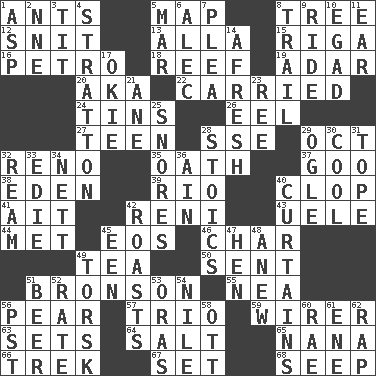 ACROSS 1. Pismires 5. Atlas unit 8. Relationship diagram 12. In a ____ (agitated or irritated) 13. Silent film actress Nazimova 15. Port city in Latvia 16. Stone: prefix 18. Coral ridge 19. The sixth month of the Jewish calendar 20. Alias (abbr.) 22. Borne 24. Metal containers 26. Snakelike fish 27. Adolescent 28. Compass dir. 29. Sep. follower 32. Former U.S. Attorney General Janet 35. Pledge 37. Thick or sticky substance 38. Paradise 39. _ de Janeiro 40. Hoof sound 41. Small island 42. Painter Guido (1575-1642) 43. Ubangi River tributary 44. Was introduced to 45. Greek goddess of the dawn 46. Burn to charcoal 49. Beverage made from leaves 50. Posted 51. "Death Wish" actor 55. Teachers' org. 56. Lightbulb-shaped fruit 57. Musical group of three 59. One who wires 63. Puts into a specified state 64. Table seasoning 65. Nanny 66. Long journey 67. Arrange properly for use 68. Ooze DOWN 1. Viper 2. Compass dir. 3. Teat (slang) 4. Ski resort town in Vermont 5. Third mo. 6. Actor Baldwin 7. Entreaty 8. Hang back 9. Travel on or in a vehicle 10. Mild oath 11. Ewer handle 14. Anew 17. Migrant worker of the '30s 21. One (Scot) 23. Portuguese money of account (variant) 25. Sounds asleep 28. Unemotional ones 29. Stare 30. Calm and collected 31. Drink excessively 32. 480, 500 or 516 sheets of paper 33. Singer Brickell 34. Remaining after all deductions 36. The 18th letter of the Arabic alphabet 40. Window treatments 42. Cooks with dry heat, as in an oven 45. Car or cant ending 47. Layer 48. Afresh 49. Cod relative 51. Fermented drink made from hops 52. Pace 53. Mouths or openings 54. "Death on the ____" 56. Pacific Standard Time (abbr.) 58. Baseball player Mel 60. Actress Charlotte 61. Compass dir. 62. Strike