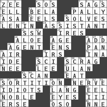 ACROSS 1. Last letter of the English alphabet 4. Mayday 7. Settles 11. Pipe bend 12. Actor Lugosi 13. Chummy 14. White ___ sheet 15. Snakelike fish 16. Finds the solution 17. Soviet premier 1918-24 19. Helper 21. Compass dir. 23. Angers 24. _ vera 25. Ripen 26. Find the sum of 29. Rep 30. Followers of ems 31. Baking dish 32. Atmosphere 33. Big collection agency 34. _ tizzy (2 wds.) 35. Binary compound 36. _-fi 37. Lean end of the neck 40. Born 41. Area sheltered from the wind 42. Uhlan (variant) 43. Examine minutely or intensely 45. Ingest 46. Decision 51. Impudent aggressiveness 55. Foolish or stupid persons 56. Long (Scottish) 58. Snakelike fish 59. Impressive in appearance 60. Sight organs 61. One more than two 62. Celtic language 63. Bear (Spanish) 64. Compass dir. DOWN 1. Ardor 2. Otherwise 3. Enthusiasm 4. Observe 5. Rounded earthenware pot or jar 6. Backtalk 7. Table seasonings 8. Inventor's middle name 9. Small, secluded valley 10. System (abbr.) 12. Gillaume's butler role 13. Airs 16. Fathers 18. Capri or Wright 20. Signals 22. Dripping 24. Match 25. Nest on high 26. Bee-related 27. Mild oath, euphamism for damn 28. Heredity factor (abbr.) 29. Helper 32. The 18th letter of the Arabic alphabet 33. Ancient Celtic tribe of eastern Britain 36. Narrow boards 37. Take to court 38. Rings like a ship's bell 39. Assign a rank or rating to 43. Fur scarf 44. Quote 46. Trig term 47. Scent 48. Chest bones 49. Butter sub 50. Negative votes 52. It's straight from the horse's mouth 53. Distinctive style or manner 54. Writer Wiesel 57. Modern: prefix
