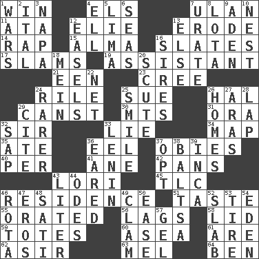 ACROSS 1. Acquire through effort 4. Raised railways 7. ____ Bator 11. _ moment's notice (2 wds.) 12. Writer Wiesel 13. Eat (away) 14. Reproach for some lapse or misdeed 15. _ mater 16. Chalkboards 17. Hits or strikes with great force 19. Helper 21. Car or cant ending 23. Algonquian 24. Cause heat under the collar 25. Institute legal proceedings 26. Actor Linden 29. 2nd pers. sing. pres. of can (arch.) 30. Mountains (abbr.) 31. Mouth or opening 32. Title for a knight 33. Untruth 34. Atlas unit 35. Had dinner 36. Snakelike fish 37. Off-Broadway awards 40. For each 41. A saturated hydrocarbon 42. Baking dishes 43. Australian parrot (variant) 45. Affectionate concern, for short 46. Home 51. Clothes sense 55. Spoke pompously 56. Fails to keep up a pace 58. Hat (slang) 59. Lugs 60. At sea 61. "We ___ not amused" (Victoria) 62. SW Saudi Arabia district 63. Cartoonist voice _ Blanc 64. Benjamin's nick name DOWN 1. Armed conflicts 2. Slanted text style (abbr.) 3. California wine valley 4. Pipe bend 5. Pale green bean 6. Oceans 7. A salt of uric acid 8. Globular water bottle used in Asia 9. Arabian gulf 10. Egg locale 12. Artist's stands 13. Otherwise 16. Founders of families 18. Chow _ 20. Snake scale 22. Fish or hair follower 24. More valued for its uncommonness 25. Grin 26. Residences 27. Ancient river in northeast Turkey 28. Pet locale 29. Quote 32. Plant excrement 33. Soviet premier 1918-24 36. Having ears or earlike features 37. Choose 38. Greek mezzo-soprano Agnes 39. South American Indian 43. 61 cubic inches 44. Lyric poems 46. Round or rotation of duties 47. Greek god of love 48. Suttee (variant) 49. Dollar (slang) 50. Comfort 52. Thick slice 53. Hoop that covers a wheel 54. Locale of original sin 57. Set