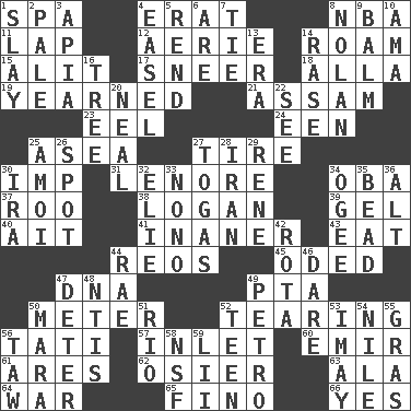 ACROSS 1. Health resort 4. Part of Q.E.F. 8. Basketball assoc. 11. Pet locale 12. Nest on high 14. Wander aimlessly 15. Set down 17. Contemptuous expression 18. Silent film actress Nazimova 19. Had a strong desire 21. Indian state 23. Snakelike fish 24. Car or cant ending 25. Toward the sea 27. Become fatigued 30. Naughty child 31. Poe poem 34. Chief or king in Benin or Nigeria 37. Friend of Pooh 38. Utah city north of Ogden 39. Set 40. Small island 41. More lacking in sense or substance 43. Consume 44. Vintage cars 45. Wrote a lyric poem 47. Heredity factor (abbr.) 49. Parent Teacher Assoc. 50. Distance measurement 52. Pulling into pieces 56. Jacques of French films 57. An arm off of a larger body of water 60. Arab leader 61. Ancient Greek god of war 62. Flexible twig of a willow tree 63. Wing 64. Armed conflict 65. Fine (Spanish) 66. It is so DOWN 1. Kill 2. Diluted with white 3. Capital of Western Samoa 4. Artist's stand 5. Tear apart 6. "We ___ not amused" (Victoria) 7. Make a knot 8. Pitcher Ryan 9. Lip ointment 10. Wet nurse (var.) 13. Period 14. To erase 16. Relationship diagram 20. Anneal 22. Observe 25. Mine, in Marseilles 26. Blemish 27. Ancient Roman robes 28. SW Asia republic 29. French philosopher Descartes 30. Lyricist Gershwin 32. Writer Wiesel 33. Words to Nanette 34. Double curve, resembling the letter S 35. Necklace unit 36. Keyboard modifier key 42. Roll call or roster of names 44. Actress Charlotte 46. Have the gumption 47. Prevent from occurring 48. Nuclear Threat Initiatives 49. Stone: prefix 50. Hindu Mythology: god of death 51. _ de Janeiro 52. Adolescent 53. "If ____ say so..." 54. "Death on the ____" 55. Pate de foie ____ 56. The 23rd letter of the Hebrew alphabet 58. Science/research agcy. 59. Cards in a Roman deck?