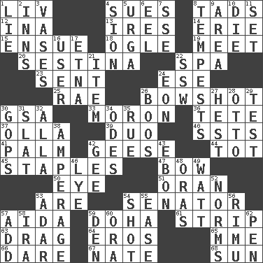 ACROSS 1. 54 in ancient Rome 4. Takes to court 8. Small amounts or degrees 12. _ tizzy (2 wds.) 13. Angers 14. One of the Great Lakes 15. Take place subsequently 18. Stare at amorously 19. Rendezvous 20. French poetic form 22. Health resort 23. Emitted 24. Compass dir. 25. Actress Charlotte 26. The distance a bow sends an arrow 30. Girls' org. (abbr.) 33. Person of subnormal intelligence 36. Wig 37. Water jar 39. Superhero pair 40. Fast planes 41. Inside of hand 42. Honkers 44. Small child 45. Paper fasteners 47. Arrow shooter 50. Sight organ 51. Northwest Algerian city 53. "We ___ not amused" (Victoria) 54. Legislator 57. Opera by Verdi 59. Capital of the state of Qatar 61. Remove all contents or possession from 63. To be drawn or hauled along 64. Greek god of love 65. Madame (abbr.) 66. Have the gumption 67. Nathan's nickname 68. Player for Phoenix DOWN 1. Untruth 2. Lodging establishments 3. Flower holders 4. The Jewish people; Israel 5. Capital and largest city of Mongolia 6. Snakelike fish 7. Compass dir. 8. Storms 9. Length times width 10. Pass on 11. Arrange properly for use 16. One who makes use of a thing 17. Inactive volcano in Sicily 21. A whole individual unit 22. Compass dir. 24. A really long time 26. Scornful sounds 27. Command 28. "Beetle Bailey" pooch 29. Trial 30. Republicans 31. Narrow board 32. Silent film actress Nazimova 34. Lyric poems 35. Regret 38. Electrical Measurement 42. Turn to the right 43. Inky black, to poets 46. Sodium hydroxide 48. Mouths or openings 49. Electrical Unit 52. Typical models 53. The sixth month of the Jewish calendar 54. Opportunity 55. Relaxation 56. Tall New Zealand timber tree 57. Increase 58. Retirement account (abbr.) 59. Lair 60. Mouth or opening 62. Animal enclosure