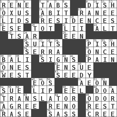 ACROSS 1. French philosopher Descartes 5. Bar bills 9. Food container 13. The longest river in Central Asia 14. "This won't hurt ____!" 15. Indian princess (variant) 16. Flaplike coverings 17. Homes 19. Compass dir. 20. Small child 21. Cards in a Roman deck? 22. Keyboard modifier key 23. Russian ruler of old 25. Car or cant ending 26. Sets of matching outer garments 30. Expression of disdain 34. Spanish missionary in California 35. Single time 36. Indonesian resort city 39. Attaches a signature 42. Ache 43. Singles 44. Take place subsequently 46. 270 degrees 47. Sleazy 48. Greek goddess of the dawn 51. Period of immesurable duration 54. Institute legal proceedings 57. Mouth edge 58. Snakelike fish 60. ___ good deed 62. Interpreter 65. Scent 66. Match 67. Western Nevada city 68. Take ten 69. To erase 70. Backtalk 71. Algonquian DOWN 1. Hero or heavy, e.g. 2. Be extant 3. Unadorned figures 4. Curvy letter 5. Pacific island yam 6. Collude with 7. Altar cloth linen 8. Vertical member of a panel or frame 9. Daniel's nick name 10. South American Indian 11. Sew up the eyelids of hawks and falcons 12. Behest 15. It's straight from the horse's mouth 18. Expire 20. Loyal 24. Aid 27. Big collection agency 28. Three (prefix) 29. Gurus 30. Wimpy's pal 31. _ tizzy (2 wds.) 32. _-fi 33. Layer 36. Arrow shooter 37. A saturated hydrocarbon 38. French article 40. Compass dir. 41. Compass dir. 45. Allodial 48. Otherwise 49. Lubricate 50. Practice fights 52. More peculiar 53. Trap for birds or small mammals 54. Play the lead 55. Capital and largest city of Mongolia 56. Hearing organs 58. Immeasurably long periods of time 59. Greek god of love 61. Johnson of "Laugh-In" 63. Born 64. Beverage made from leaves 65. The grampus (Milton)