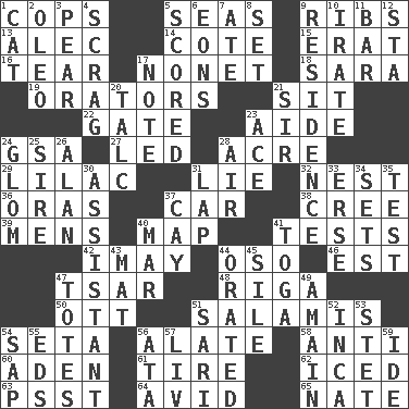 ACROSS 1. 911 reaches them 5. Oceans 9. Chest bones 13. Actor Baldwin 14. ____ d'Azur (French Riviera) 15. Part of Q.E.F. 16. Lacerate 17. Music written for nine 18. "Two Mules for Sister ____" 19. Speakers 21. Be seated 22. Yard entry 23. Helper 24. Girls' org. (abbr.) 27. Directed 28. 43,560 square feet 29. Pale purple color 31. Falsehood 32. Egg locale 36. Mouths or openings 37. Automobile 38. Algonquian 39. Not women's 40. Atlas unit 41. Trials 42. "If ____ say so..." 44. Bear (Spanish) 46. Eastern Standard Time (abbr.) 47. Russian ruler of old 48. Port city in Latvia 50. Baseball player Mel 51. Deli grouping 54. Stalk of a moss capsule 56. Having winglike extensions 58. Opposed to 60. An important port of Yemen 61. Hoop that covers a wheel 62. On the rocks 63. Inconspicuous attention getter 64. Enthusiastic 65. Nathan's nickname DOWN 1. Domesticated feline 2. Margarine 3. Lightbulb-shaped fruit 4. Lean end of the neck 5. Tallied 6. Immeasurably long periods of time 7. Had dinner 8. Arrange properly for use 9. Dwelling 10. Feeling or showing extreme anger 11. Tavern 12. R.R. building 17. Brief written record 20. Baby powder 21. Title for a knight 23. Adept person 24. Take by theft 25. Beget 26. ____ Jay Lerner 28. Atmosphere 30. Helper 31. Infant locale 33. Celtic language 34. Puts into a specified state 35. Trial 37. Island 40. Third mo. 41. Ancient Roman robe 43. Floor protector 44. Spoke pompously 45. Filth; sediment 47. Lugs 49. With great haste 51. Indian skirt 52. South American Indian 53. Proofreading order 54. Plant excrement 55. Begley and Asner 56. "One Day ___ Time" 57. 54 in ancient Rome 59. Binary compound