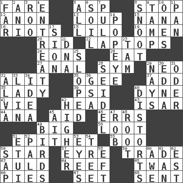 ACROSS 1. Conductor's collection 5. Cleo's killer 8. Close up, plug up 12. At once, immediately (arch.) 13. Central Nebraska county 15. Grandmother 16. Disturbances 18. _ and Stitch 19. Sign of something about to happen 20. To free from 22. Portable computers 24. Immeasurably long periods of time 26. Erode 27. Of or related to the anus 28. Symbol (abbr.) 29. Modern: prefix 32. Came down and settled, as after flight 35. Double curve, resembling the letter S 37. Say or write further 38. Kenny Rogers chart-topper in '80 39. Air pressure measure (abbr.) 40. Unit of force 41. Compete 42. Froth on beer 43. Austrian river, tributary to the Danube 44. Santa ___, CA 45. Assist 46. Blunders 49. Large 50. Spoils 51. Curse 55. Surprise greeting 56. Play the lead 57. Jane of fiction 59. Buy and sell 63. Old (Scot.) 64. Coral ridge 65. It was, poetically 66. Sliced desserts 67. Arrange properly for use 68. Transmitted DOWN 1. At a great distance 2. Cuckoo 3. Friend of Pooh 4. Plea 5. Everything 6. Earth 7. Monetary unit of Botswana 8. Snob 9. Pack (down) 10. Washington bills 11. Baking dish 14. Wimpy's pal 17. The Jewish people; Israel 21. Heredity factor (abbr.) 23. Scottish cap 25. Slanted 28. A glass for beer 29. Negative votes 30. Pulitzer Prize-winning author Ferber 31. River in Europe 32. Inventor's middle name 33. (Had) reclined 34. The content of cognition 36. Girls' org. (abbr.) 40. What propaganda does 42. Having greater elevation 45. Small island 47. Director Reiner 48. Carrot, for example 49. Avian creatures 51. Needle holder 52. Diluted with white 53. Sight organs 54. Relationship diagram 56. Plant excrement 58. Newt 60. Deep reverence 61. Daniel's nick name 62. Eastern Standard Time (abbr.)