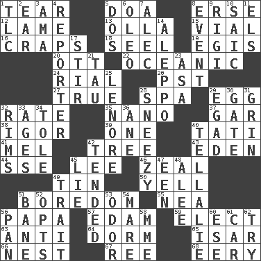 ACROSS 1. Pull into pieces 5. ___ good deed 8. Celtic language 12. Unable to walk 13. Spanish pot 15. Small bottle 16. Dice game 18. Sew up the eyelids of hawks and falcons 19. The front part of a cuirass 20. Baseball player Mel 22. Pertaining to the sea 24. Monetary unit of Yemen 26. Pacific Standard Time (abbr.) 27. Loyal 28. Health resort 29. Ovum 32. Assign a rank or rating to 35. Billionth: prefix 37. Slender fish 38. Russian composer Stravinsky 39. Single 40. Jacques of French films 41. Cartoonist voice _ Blanc 42. Woody plant 43. Genesis locale 44. Compass dir. 45. Area sheltered from the wind 46. Ardor 49. Metal container 50. Shout 51. Mood resulting from idleness 55. Teachers' org. 56. Dad 57. Dutch treat 59. Opt 63. Against 64. Dormintory (informal) 65. Austrian river, tributary to the Danube 66. Egg locale 67. To sift 68. Suggestive of the supernatural DOWN 1. Affectionate concern, for short 2. Ewer handle 3. Housemaid (var.) 4. Newsperson 5. Two (Sp.) 6. Butter sub 7. Actor Baldwin 8. Happening 9. Swiss mountan, "Queen of the Mountains" 10. Ketch in the Levant 11. Raised railways 14. City in Syria 17. Agitate 21. The 19th letter of the Greek alphabet 23. White ___ sheet 25. Poe poem 28. Dwarf with a sinus problem 29. Mild oath 30. Yard entry 31. Smile widely 32. Basketball hoops 33. Grows older 34. Lacquered or enameled metalware 36. One (Scot) 40. Copy Pinocchio 42. Watched over 45. Whopper 47. Car or cant ending 48. Toward shelter 49. Distinguishing feature 51. Object of repulsion 52. Elects 53. Aroma 54. Female horse 56. Baking dish 58. Madame (abbr.) 60. Compass dir. 61. 4-wheeled motor vehicle 62. Attempt