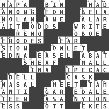 ACROSS 1. California wine valley 5. Storage container 8. Possessed 11. Amid 13. Period of immesurable duration 14. Actor Lugosi 15. Pitcher Ryan 16. One (Scot) 17. Having or resembling wings 18. Small island 19. Probability 21. Compose 22. San ____ (Riviera town) 24. Mitch Miller's instrument 25. Eats (away) 27. Ewer handle 29. The Jewish people; Israel 30. A small or young owl 32. Pulitzer Prize-winning author Ferber 33. Artist's stand 35. Blind as ____ 39. Archer's quiver 41. Shopping center 42. _ tizzy (2 wds.) 43. Medicinal drug used to evoke vomiting 45. Small valley 48. Keg 49. Relating to the nose 50. Confront 52. Scottish cap 55. Opposed to 56. Slender fish 57. Peak District village in England 59. Adolescent 60. White ___ sheet 61. High-strength synthetic material 62. Curvy letter 63. Baseball player Mel 64. Supplements with great effort DOWN 1. Nanny 2. Mine, in Marseilles 3. Coward 4. Santa ___, CA 5. Necklace unit 6. Charged atoms 7. Compass dir. 8. Sun: prefix 9. Having winglike extensions 10. Have the gumption 12. Dwarf 14. Sharp remark 20. Two (Sp.) 21. Had on 23. Ferber et al. 25. Compass dir. 26. To free from 27. She-sheep 28. 100% 30. Order of Saint Francis (abbr.) 31. Softens 33. Car or cant ending 34. American Automobile Association (abbr.) 36. Sass 37. According to 38. Affectionate concern, for short 40. Land elevation 43. Frozen water 44. Eucharist need 45. Natives or inhabitants of Denmark 46. _____ Park, CO 47. (Had) reclined 49. Nathan's nickname 50. Vertical spar for supporting sails 51. Part of Q.E.F. 53. Medicinal plant 54. Not women's 56. E Mali city 58. Color