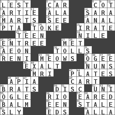 ACROSS 1. For fear that 5. Automobile 8. Small bed 11. Nick name for Arthur 13. Chicken ___ king 14. "Two Mules for Sister ____" 15. Shops 16. Observe 17. Of or related to the anus 18. Parent Teacher Assoc. 19. Casino tip 21. Feeling or showing extreme anger 22. Adolescent 24. "Death on the ____" 25. Main course 27. Was introduced to 29. Period of immesurable duration 30. For Whom the Bell _____ 32. Painter Guido (1575-1642) 33. Catcalls? 35. Double curve, resembling the letter S 39. Glorify 41. Religious women 42. Medical imaging device (abbr.) 43. Food holders 45. Capital of Western Samoa 48. Draw slowly or heavily 49. Naughty children 50. Plate 52. Single; one (prefix) 55. Stare 56. _ de Janeiro 57. Having ears or earlike features 59. Lip ointment 60. Car or cant ending 61. Showing deterioration from age 62. Playfully artful 63. Begley and Asner 64. Silent film actress Nazimova DOWN 1. Desk light 2. Part of Q.E.F. 3. Ski resort town in Vermont 4. Teat (slang) 5. Keg 6. Toward shelter 7. Actress Charlotte 8. Lessep's creation 9. Declaim 10. Story 12. First name in cosmetics 14. Indian skirt 20. Single 21. International (abbr.) 23. Bert's buddy 25. Hearing organ 26. Born 27. Cut the grass 28. Raised railways 30. Small child 31. Underwater navigation system 33. Spoil 34. Biblical high priest 36. From the throat 37. Compass dir. 38. Double-curved letter 40. Dec. holiday 43. Personal Computers (abbr.) 44. Shoestrings 45. Therefore, facetiously 46. Chummy 47. A distinct part 49. Moves up and down 50. Passed on 51. Charged atoms 53. 1994 drama film starring Jodie Foster 54. The main thing one is thinking about 56. Portuguese money of account (variant) 58. _ moment's notice (2 wds.)