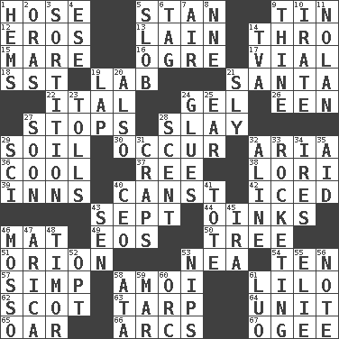 ACROSS 1. Flexible conduit 5. Comedian Laurel of Laurel & Hardy 9. Shallow baking pan 12. Greek god of love 13. (Had) reclined 14. Through, poetically 15. Female horse 16. Legendary monster 17. Small bottle 18. Fast jet (abbr.) 19. Experiment locale 21. Before Barbara or Clara 22. Slanted text style (abbr.) 24. Set 26. Car or cant ending 27. Closes up, plugs up 28. Kill 29. Earth 30. Happen 32. Operatic vocal solo 36. Calm and collected 37. To sift 38. Australian parrot (variant) 39. Restaurants 40. 2nd pers. sing. pres. of can (arch.) 42. On the rocks 43. Back-to-school mo. 44. Pig sounds 46. Floor protector 49. Greek goddess of the dawn 50. Family _ (genealogy) 51. Constellation of myth 53. Teachers' org. 54. Nine, plus one 57. Simple or foolish person 58. Mine, in Marseilles 61. _ and Stitch 62. Highlander 63. Canvas cover 64. A single undivided whole 65. Boat paddle 66. Curves 67. Double curve, resembling the letter S DOWN 1. Cloth borders 2. Mouths or openings 3. Making a chance decision by using lots 4. Compass dir. 5. Messy guy 6. Label 7. Atmosphere 8. Compass dir. 9. One or ones belonging to thee 10. Feeling or showing extreme anger 11. Pitcher Ryan 14. Federal power corp. 19. Pet locale 20. In addition 21. Wily 23. For Whom the Bell _____ 24. Adhesives 25. Hearing organ 27. Within a short period 28. Aroma 29. _-fi 31. Dice game 32. Place in a line 33. Shooting up abruptly 34. Angers 35. Help 40. Corporate head (abbr.) 41. Lug 43. Elected rep. 45. Retirement account (abbr.) 46. With motion or animation 47. N. Chile seaport 48. Southeast Indonesia island 52. Choose 53. Cuts off 55. Writer Wiesel 56. Observe 58. "One Day ___ Time" 59. Make imperfect 60. The grampus (Milton) 61. Nilotic language