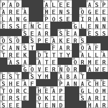 ACROSS 1. Groovy apt. 4. Toward shelter 8. Viper 11. Type of rug 13. Not women's 14. Double curve, resembling the letter S 15. Austrian-born American filmmaker Fritz 16. Introduce or present, as a question 17. SW Asia republic 18. Gist 21. American astronaut and politician John 22. Dry up 23. Ocean 25. Double-curved letter 26. Bear (Spanish) 29. Orators 32. 2nd pers. sing. pres. of can (arch.) 34. Distant 35. Clumsy lout 38. Long journey 39. Short, simple song 41. Silent film actress Nazimova 43. White ___ sheet 44. Had dinner 45. Channel Islands abalone 46. State head 50. Deep reverence 51. Eastern Standard Time (abbr.) 54. Symbol (abbr.) 55. Blind as ____ 57. Archer's quiver 59. Flamboyance 63. Torque (variant) 64. Pile 67. Take by theft 68. Celtic language 69. Migrant worker of the '30s 70. Indian skirt 71. Observe 72. Look after 73. Make imperfect DOWN 1. Diluted with white 2. Ancient river in northeast Turkey 3. Habitations of wild animals 4. Electrical Unit 5. Lion 6. Followers of ems 7. Compass dir. 8. Match 9. Seines 10. Actor Sean's family 12. Matures 14. Petroleum 19. A home for chicks 20. Head covering 21. Slender fish 23. Three-handed card game 24. Suggestive of the supernatural 26. Sep. follower 27. "Two Mules for Sister ____" 28. Washington bills 30. Following 31. Fly high 33. Heroin 36. _ mater 37. Soared 39. American folk hero Crockett 40. A whole individual unit 42. "We ___ not amused" (Victoria) 45. Northwest Algerian city 47. Order of Saint Francis (abbr.) 48. Slept 49. Chief or king in Benin or Nigeria 51. _____ Park, CO 52. Dinah or Pauly 53. Laconic 56. Labels 58. Adept person 60. Dollar (slang) 61. Israeli folk dance 62. Arab leader 64. Being at a high temperature 65. Make supply last 66. The 18th letter of the Arabic alphabet