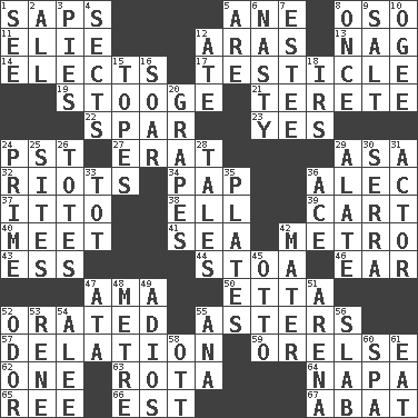 ACROSS 1. Plant excrements 5. One (Scot) 8. Bear (Spanish) 11. Writer Wiesel 12. Ancient river in northeast Turkey 13. Tired old horse 14. Opts 17. A testis 19. Moe Howard, for one 21. Cigar-shaped 22. Practice fight 23. Affirmative reply 24. Pacific Standard Time (abbr.) 27. Part of Q.E.F. 29. White ___ sheet 32. Debaucheries 34. Infant food 36. Actor Baldwin 37. "Tell ____ the Marines!" 38. Pipe bend 39. Heavy open wagon 40. Rendezvous 41. Ocean 42. Paris' subway 43. Double-curved letter 44. Portico 46. Ewer handle 47. Housemaid (var.) 50. Singer James 52. Declaimed 55. Michaelmas daisies 57. Conveyance 59. Threatening words 62. Single 63. Round or rotation of duties 64. California wine valley 65. Portuguese money of account (variant) 66. Eastern Standard Time (abbr.) 67. Blind as ____ DOWN 1. Perceive with the eye 2. 100% 3. Sliced desserts 4. Religious groups 5. "We ___ not amused" (Victoria) 6. Smutty 7. First name in cosmetics 8. At one time in the past 9. Table seasoning 10. Double curve, resembling the letter S 12. Had dinner 15. Drinks excessively 16. Fly high 18. Big collection agency 20. Wine fruits 24. A-one 25. Locates 26. Lugs 28. Lies 29. Having winglike extensions 30. Father Junipero _ 31. Thespian 33. Small child 35. Food holders 36. Adept person 42. Mother 45. Von Bismarck 47. _ moment's notice (2 wds.) 48. Distance measurement (Brit.) 49. Goodbye (Sp.) 51. Sports stadium 52. Aroma 53. French philosopher Descartes 54. Toward shelter 55. Santa ___, CA 56. Broad, flat, thick piece 58. Baseball player Mel 60. Health resort 61. Erode