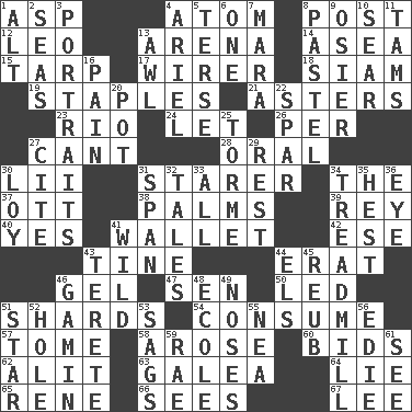 ACROSS 1. Viper 4. Smallest unit of an element 8. Mail 12. Lion 13. Sports stadium 14. At sea 15. Canvas cover 17. One who wires 18. Thailand, formerly 19. Paper fasteners 21. Michaelmas daisies 23. _ de Janeiro 24. Allow 26. For each 27. Patter 28. Spoken 30. Cards in a Roman deck? 31. A viewer who gazes fixedly 34. Definite Article 37. Baseball player Mel 38. Insides of hands 39. Marina Del _, California 40. It is so 41. Place for singles 42. Compass dir. 43. Prong on a fork 44. Part of Q.E.F. 46. Set 47. Elected rep. 50. Directed 51. Broken pieces 54. Ingest 57. Heavy book 58. Came up 60. Auction offers 62. Set down 63. An organ shaped like a helmet 64. Falsehood 65. French philosopher Descartes 66. Perceives with the eye 67. Area sheltered from the wind DOWN 1. The first octave above the treble staff 2. Oceans 3. Likenesses of persons 4. Satellite of Uranus 5. Laconic 6. Single 7. Hindu Mythology: god of death 8. Soft color 9. Flexible twig of a willow tree 10. Shrivel 11. Scottish caps 13. Leather borer 16. Ache 20. Plant holder 22. Practice fight 25. Singer Mel 27. Quote 29. State of inaction 30. Myrna of the movies 31. Connect, as a bridge 32. Falsehoods 33. 100% 34. Excercise machine 35. Behest 36. Sight organ 41. Rampant 43. Cylindrical with tapered ends 44. Raised railways 45. Reuben's nickname 46. Street urchin 48. Learning spot: Fr. 49. Olfactory organs 51. Play the lead 52. Opening into or through something 53. Droops 55. Teachers' org. 56. Singer Brickell 59. Actress Charlotte 61. Observe