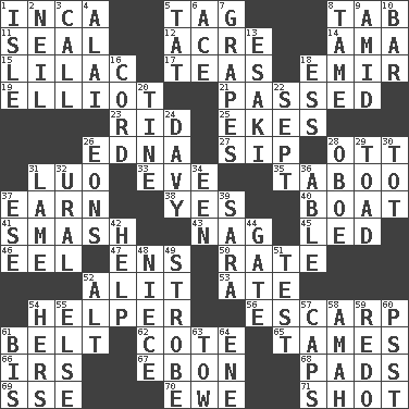 ACROSS 1. South American Indian 5. Label 8. Bar bill 11. Lick closed 12. Land measure 14. Nursemaid (var.) 15. Pale purple color 17. Beverages made from leaves 18. Arab leader 19. American author Paul (1891-1958) 21. Went by 23. To free from 25. Makes supply last 26. Pulitzer Prize-winning author Ferber 27. Small drink 28. Baseball player Mel 31. Nilotic language 33. Night before a holiday 35. Off limits 37. Merit 38. It is so 40. Water vessel 41. Box-office sellout 43. Tired old horse 45. Directed 46. Snakelike fish 47. Followers of ems 50. Pace 52. Came down and settled, as after flight 53. Had dinner 54. Assistant 56. Fortification 61. Waist strap 62. ____ d'Azur (French Riviera) 65. Makes less strong or intense 66. Big collection agency 67. Inky black, to poets 68. Writing tablets 69. Compass dir. 70. She-sheep 71. Went for two points DOWN 1. Small island 2. Famous astronaut Armstrong 3. Give a ring to 4. Jai _ 5. Make lace 6. Adept person 7. Raisin fruits 8. Not wild 9. Among 10. Long, evenly shaped piece 13. 1973 Nobel Price Winner (Physics) Leo 16. Drawstring 18. Curvy letter 20. Prong on a fork 22. Back-to-school mo. 24. _ Jones' Locker 26. Immeasurably long periods of time 28. Mitch Miller's instrument 29. Frog relative 30. Small child 31. Unable to walk 32. Mountain range 34. Car or cant ending 36. Competent 37. Compass dir. 39. "Two Mules for Sister ____" 42. Aid 44. Yard entry 48. Sibling's daughter 49. Disco prop 51. Trial 52. The first octave above the treble staff 54. Possessive pronoun 55. Otherwise 57. Balmoral and tarboosh 58. Wet nurse 59. Make new 60. Inconspicuous attention getter 61. Twice 63. Pull behind 64. Compass dir.