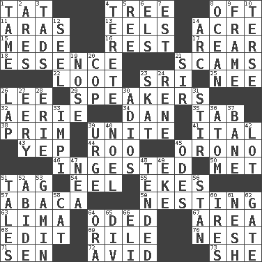 ACROSS 1. Make lace 4. Relationship diagram 8. Often (poetically) 11. Caspian sea tributary 13. Snakelike fish 14. Measure of real estate 15. Ancient Persian 16. Remainder 17. Posterior 18. Substance 21. Fraudulent business schemes 22. Spoils 23. _ Lanka 25. Born 26. Area sheltered from the wind 29. Orators 32. Nest on high 34. One of the 12 tribes of Israel 35. Keyboard key 38. Demure 39. Join together 41. Slanted text style (abbr.) 43. Slangy assent 44. Friend of Pooh 45. U. of Maine site 46. Swallowed 50. Was introduced to 51. Label 54. Snakelike fish 55. Supplements with great effort 57. Phillipine bananalike plant 59. Inhabiting a nest 63. Pale green bean 64. Wrote a lyric poem 67. Type of rug 68. Prepare for publication 69. Cause heat under the collar 70. Egg locale 71. Elected rep. 72. Enthusiastic 73. A female animal or person DOWN 1. Docile 2. Ancient Greek god of war 3. Small boys 4. Cylindrical with tapered ends 5. Portuguese money of account (variant) 6. Raised railways 7. Eastern Standard Time (abbr.) 8. Sea 9. Movie unit 10. Laconic 12. Stitch closed the eyes of (a falcon) 14. Curve 19. Sense of smell 20. Police officer (slang) 21. Title for a knight 23. Three-handed card game 24. French philosopher Descartes 26. Infant locale 27. Suggestive of the supernatural 28. One of the Great Lakes 30. Goodbye (Sp.) 31. Move through with a circular motion 33. Body of Kaffir warriors 36. Smallest unit of an element 37. Object of repulsion 39. Goad 40. Christmas carol 42. Car dealer's back yard 45. Lyric poems 47. Teachers' org. 48. Looked after 49. Make supply last 51. Falsehoods 52. Stay 53. Homeless child 56. Comedian Laurel of Laurel & Hardy 58. Feline 60. Angers 61. Delicate 62. Yard entry 64. Mouth or opening 65. HTML Container Element 66. Connecticut Ivy Leaguer