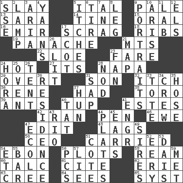 ACROSS 1. Kill 5. Slanted text style (abbr.) 9. Diluted with white 13. "Two Mules for Sister ____" 14. Prong on a fork 15. Relating to the mouth 16. Arab leader 17. Lean end of the neck 18. Teases 19. Flamboyance 21. Mountains (abbr.) 22. A type of plum 23. Conductor's collection 24. Being at a high temperature 27. ___ a Wonderful Life 28. California wine valley 29. Unconcealed 31. Manchild 32. Hankering 36. French philosopher Descartes 37. Possessed 38. "Corrida" creature 39. Pismires 40. Uncastrated adult male sheep 41. _____ Park, CO 42. SW Asia republic 44. Fenced enclosure 46. She-sheep 47. Prepare for publication 48. Straggles 50. Corporate head (abbr.) 51. Borne 54. Inky black, to poets 56. Small pieces of grounds 58. 480, 500 or 516 sheets of paper 60. Baby powder 61. Quote 62. 4th largest of the Great Lakes 63. Algonquian 64. Observes 65. System (abbr.) DOWN 1. Compass dir. 2. Desk light 3. Roberta Peters solo 4. Entertaining tales 5. Strong, restless desires 6. Become fatigued 7. Santa ___, CA 8. Part of a journey 9. Likenesses of persons 10. Originate 11. Experiment locale 12. Raised railways 17. Native of Scotland 20. Set down 21. Atlas unit 23. Air blower 24. Israeli folk dance 25. Baking chamber 26. Portable shelter 28. Allow head to fall sleepily 30. Dwelling 31. Plant excrement 33. Carryall 34. Group working together 35. Flexible conduit 37. Attila the _ 40. Make lace 41. Engineer (abbr.) 43. River (Sp.) 44. Food holders 45. Hearing organs 47. Learning spot: Fr. 49. Fathers 51. ____ d'Azur (French Riviera) 52. Suggestive of the supernatural 53. Raised platform 54. And so on (abbr.) 55. Long, evenly shaped piece 56. Personal Computers (abbr.) 57. Falsehood 59. Was introduced to