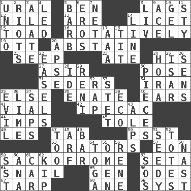ACROSS 1. Mountain range 5. Benjamin's nick name 8. Fails to keep up a pace 12. Mediterranean tributary 13. "We ___ not amused" (Victoria) 14. It is permitted: Lat. 15. Frog relative 16. Happening in regular succession 19. Baseball player Mel 20. Refrain by choice 21. Ooze 23. Had dinner 24. Part of HMS, perhaps 27. SW Saudi Arabia district 30. Introduce or present, as a question 31. Spring feasts 34. SW Asia republic 35. Otherwise 38. Maternal 40. Hearing organs 41. Small bottle 42. Medicinal drug used to evoke vomiting 44. Naughty children 45. Lacquered or enameled metalware 46. French article 47. Bar bill 50. Inconspicuous attention getter 53. Speakers 57. A really long time 59. Italian handbag shop? 63. Bristle 64. Slow-paced one 65. Commissioned mil. rank 66. Lyric poems 67. Canvas cover 68. One (Scot) 69. System (abbr.) DOWN 1. To (old English) 2. Disturbances 3. Having winglike extensions 4. Directed 5. Sharp remark 6. Greek god of love 7. Remaining after all deductions 8. 54 in ancient Rome 9. Adept person 10. Set 11. Filthy place 14. Actor's bit 17. American Automobile Association (abbr.) 18. Teat (slang) 20. Domed church section 22. Artist's stands 24. Israeli folk dance 25. Austrian river, tributary to the Danube 26. Elected reps. 28. Binary compound 29. Painter Guido (1575-1642) 30. Components 32. Hit sharply and swiftly 33. Proofreading order 35. Morally bad or wrong 36. Welles in "The Third Man" 37. Plant excrements 39. Environmental prefix 43. High mountains 47. Implement 48. Sandy's bark 49. Drinking establishment 51. Morally degraded 52. Hauls 54. Ancient Roman robe 55. Sign of things to come 56. French philosopher Descartes 58. Political cartoonist Thomas 59. Fast jet (abbr.) 60. Santa ___, CA 61. Automobile 62. Sleep 63. Mayday
