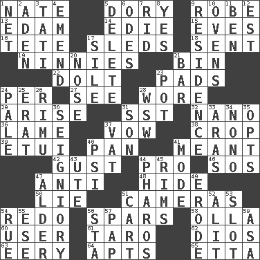 ACROSS 1. Nathan's nickname 5. Small, narrow, flatbottom fishing boat 9. Loose flowing garment 13. Dutch treat 14. Singer Brickell 15. Nights before holidays 16. False hair 17. Bobsleighs 18. Posted 19. Simpletons 21. Storage container 22. Dunce 23. Groovy apts. 24. For each 27. Observe 28. Had on 29. Ascend 31. Fast jet (abbr.) 32. Billionth: prefix 36. Unable to walk 37. Solemn pledge 38. Riding implement 39. Needle case 40. Baking dish 41. Intended 42. Abrupt rush of wind 44. Adept person 46. Distress signal 47. Opposed to 48. Flintstone garb 50. Untruth 51. Devices for capturing images 54. Do over again 56. Practice fights 58. Spanish pot 60. One who makes use of a thing 61. Edible starchy tuberous root 62. "Vaya con ____" 63. Suggestive of the supernatural 64. Tenement units (abbr.) 65. Singer James DOWN 1. Fish or hair follower 2. Arabian gulf 3. Jacques of French films 4. Make improvements or corrections to 5. Erase 6. Lyric poems 7. To free from 8. Affirmative reply 9. Home 10. Baking chambers 11. Benjamin's nick name 12. Eastern Standard Time (abbr.) 17. Filth; sediment 20. Olfactory organ 21. Oblong piece of solid material 23. Cooking vessel 24. Diluted with white 25. Part of Q.E.F. 26. Tall New Zealand timber tree 28. Compass dir. 30. Signiory (variant) 31. Male child 33. Ancient river in northeast Turkey 34. Words to Nanette 35. Chooses 37. Large container 40. Air pressure measure (abbr.) 41. Method 43. Shoshoni 44. N Egypt peninsula 45. Basketball hoops 47. Tree or shrub in the Birch family 49. Wear away 51. Heavy open wagon 52. Set down 53. Slit 54. Regret 55. Compass dir. 56. R.R. building 57. Infant food 59. White ___ sheet
