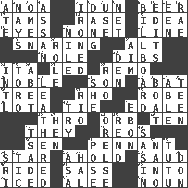 ACROSS 1. Small Philippine buffalo 5. Goddess of spring and wife of Bragi 9. Fermented drink made from hops 13. Scottish caps 14. Raze (variant) 15. The main thing one is thinking about 16. Sight organs 17. Music written for nine 18. Actor's bit 19. Catching in a trap 21. Keyboard modifier key 22. Undercover agent 23. Claim 24. Call ___ day 27. Directed 28. San ____ (Riviera town) 29. Impressive in appearance 31. Male offspring 32. Blind as ____ 36. Family _ (genealogy) 37. 17th letter of the Greek alphabet 38. Loose flowing garment 39. Globular water bottle used in Asia 40. Make a knot 41. Peak District village in England 42. Through, poetically 44. Globe 46. Nine, plus one 47. Those people 48. Vintage cars 50. Elected rep. 51. Pre-World Series prize 54. Play the lead 56. Hold, grip (Informal) 58. Saudi Arabian king (1953-1964) 60. Travel on an animal 61. Backtalk 62. To the inside or interior of 63. On the rocks 64. Toward shelter 65. Part of speech DOWN 1. Had dinner 2. Negative votes 3. Sign of something about to happen 4. Indian state 5. Pressed 6. Mild oath, euphamism for damn 7. Purpose 8. Fish or hair follower 9. Big road sign 10. Prepares for publication 11. Car or cant ending 12. Actress Charlotte 17. Mediterranean tributary 20. Hero or heavy, e.g. 21. Direct toward a target or goal 23. Lair 24. International (abbr.) 25. "Corrida" creature 26. Collude with 28. Friend of Pooh 30. Resembling or made to resemble leather 31. A female animal or person 33. Water vessel 34. Competent 35. Adolescent 37. _ de Janeiro 40. Attempt 41. Inky black, to poets 43. Layer 44. Threatening words 45. Tear apart 47. Sadhe (variant) 49. Indian antelope 51. Airs 52. Billionth: prefix 53. Ballerina skirt 54. _ Lanka 55. Nervous spasm 56. White ___ sheet 57. Actor Linden 59. Spanish title