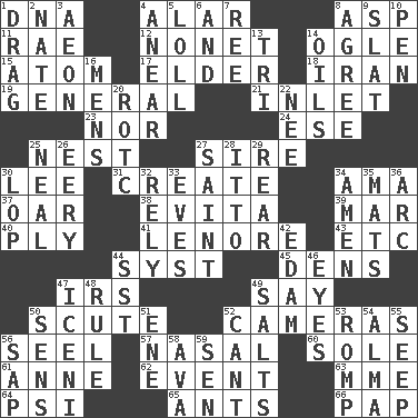 ACROSS 1. Heredity factor (abbr.) 4. Having or resembling wings 8. Viper 11. Actress Charlotte 12. Music written for nine 14. Stare 15. Tiny particle 17. A person who is older than you are 18. SW Asia republic 19. Commissioned military rank 21. An arm off of a larger body of water 23. And not 24. Compass dir. 25. A home for chicks 27. Title for a man of rank and authority 30. Area sheltered from the wind 31. Make 34. Nanny (var.) 37. Rowing implement 38. Webber/Rice musical 39. Impair 40. Apply oneself diligently 41. Poe poem 43. And so on (abbr.) 44. System (abbr.) 45. Hiding places for outlaws 47. Big collection agency 49. Declare 50. Turtle shell scale 52. Devices for capturing images 56. Stitch closed the eyes of (a falcon) 57. Rhinal 60. Not divided or shared with others 61. Queen of England 1702-14 62. Happening 63. Madame (abbr.) 64. Air pressure measure (abbr.) 65. Pismires 66. Infant food DOWN 1. To trail on the ground 2. Nathan's nickname 3. Period of immesurable duration 4. Approach 5. Hang loosely or laxly 6. Plus 7. Portuguese money of account (variant) 8. Match 9. Narrow board 10. Fenced enclosure 13. Three (prefix) 14. Petroleums 16. Not women's 20. College mil. group 22. Born 25. Be tempered by heat 26. Suggestive of the supernatural 27. Virtuous person 28. "Tell ____ the Marines!" 29. Hitchcock's "____ Window" 30. Trim (branches) 32. Trust 33. Nights before holidays 34. So be it 35. Floor protectors 36. Curve 42. Dutch treat 44. Fast jet (abbr.) 46. Sight organs 47. Ancient Celtic tribe of eastern Britain 48. Governing power 49. Table seasonings 50. Elected reps. 51. Compass dir. 52. Patter 53. Play 54. _ mater 55. Ooze 56. Plant excrement 58. Actress Gardner 59. Elected rep.