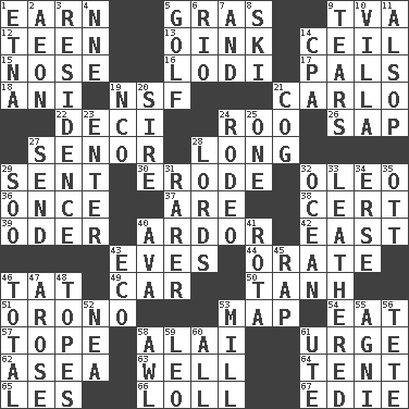 ACROSS 1. Merit 5. Pate de foie ____ 9. Federal power corp. 12. Adolescent 13. Pig sound 14. To provide with a ceiling 15. Olfactory organ 16. Farming town in central California 17. Friends 18. Cuckoo 19. Science/research agcy. 21. Monte _, Las Vegas Hotel/Casino 22. Tenth: prefix 24. Friend of Pooh 26. Plant excrement 27. Sir (Sp.) 28. Yearn 29. Transmitted 30. Wear away 32. Margarine 36. Single time 37. "We ___ not amused" (Victoria) 38. Sure thing 39. River in Europe 40. Zeal 42. 90 degrees 43. Nights before holidays 44. Declaim 46. Make lace 49. 4-wheeled motor vehicle 50. Hyperbolic tangent 51. U. of Maine site 53. Atlas unit 54. Ingest 57. Drink excessively 58. Mountain range southwest of Kyrgyzstan 61. Goad 62. At sea 63. Not ill 64. Portable shelter 65. French article 66. Hang loosely or laxly 67. Singer Brickell DOWN 1. Inactive volcano in Sicily 2. Period of immesurable duration 3. Home 4. Compass dir. 5. _ course 6. _ de Janeiro 7. Also 8. What Jean-Claude Killy likes to do 9. Pulls into pieces 10. Country estate 11. Columnist Joseph or Stewart 14. Tax preparer (abbr.) 19. Non-commissioned officer (abbr.) 20. Father 21. Gear tooth 23. Keyboard key 24. Cowboy competition 25. Single 27. Transmit 28. Nobles 29. "Barney Miller" actor Jack 31. More uncommon 32. Sea 33. Tough but pliablecoriaceous 34. Celtic language 35. Baseball player Mel 40. Actress Gardner 41. Round or rotation of duties 43. Environmental prefix 45. Hit sharply and swiftly 46. "_____ Recall" 47. Came up 48. Drinks excessively 52. Teachers' org. 53. Place where flour is made 55. Hindu god of fire 56. Wig 58. Leather borer 59. Lion 60. Everything 61. Shoshoni
