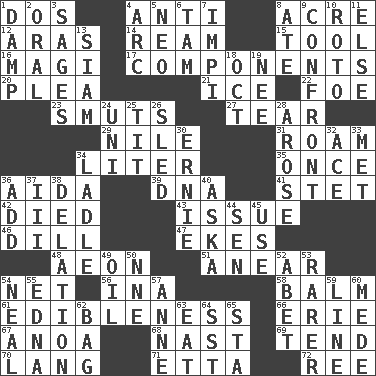 ACROSS 1. Two (Sp.) 4. Opposed to 8. 43,560 square feet 12. Caspian sea tributary 14. 480, 500 or 516 sheets of paper 15. Implement 16. Wise men 17. Pieces 20. Entreaty 21. Frozen water 22. Enemy 23. Particles of soot 27. Pull into pieces 29. Mediterranean tributary 31. Wander aimlessly 34. 61 cubic inches 35. Single time 36. Opera by Verdi 39. Heredity factor (abbr.) 41. Proofreading order 42. Passed on 43. Come out of 46. Deli pickle 47. Supplements with great effort 48. A really long time 51. Approach 54. Fish or hair follower 56. _ tizzy (2 wds.) 58. Lip ointment 61. The property of being fit to eat 66. One of the Great Lakes 67. Small Philippine buffalo 68. Political cartoonist Thomas 69. Be inclined (to) 70. Long (Scottish) 71. Singer James 72. To riddle DOWN 1. Moist 2. Of the mouth 3. Gurus 4. Curve 5. Modern: prefix 6. Scottish cap 7. Body of Kaffir warriors 8. Had dinner 9. Meet 10. Printing process, for short 11. Otherwise 13. Thailand, formerly 18. Sep. follower 19. Born 24. Corn or form start 25. Teat (slang) 26. Downhill vehicle 28. Came up 30. Bert's buddy 32. Adept person 33. Was introduced to 34. Dipping utensil 36. Find the sum of 37. One more than two 38. Conveyance 40. "____ silly question..." 44. Elected rep. 45. Purpose 49. Lubricate 50. Compass dir. 52. Collude with 53. More uncommon 54. Actress Patricia 55. Pulitzer Prize-winning author Ferber 57. Singer Murray 59. Actor's bit 60. Ancient Persian 62. Container for groceries 63. Consume 64. Fast jet (abbr.) 65. R.R. building