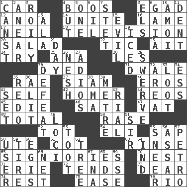 ACROSS 1. Automobile 4. Expressions of contempt or scorn 8. Mild oath 12. Small Philippine buffalo 14. Join together 16. Unable to walk 17. Famous astronaut Armstrong 18. Household entertainment appliance 20. First course 22. Nervous spasm 23. Small island 24. Attempt 25. Santa ___, CA 28. French article 30. Colored 31. A sleeping potion; an opiate (poet.) 35. Actress Charlotte 37. Thailand, formerly 40. Greek god of love 41. Automatically 42. Homing pigeon 44. Vintage cars 45. Singer Brickell 46. Suttee (variant) 47. Large container 48. Add up to 50. Raze (variant) 52. Small child 54. Biblical high priest 55. Plant excrement 58. Shoshoni 61. Small bed 63. Remove soap 65. Seigniories (variant) 70. Egg locale 71. One of the Great Lakes 72. Is inclined (to) 73. Letter starter 74. Respite 75. Relaxation 76. _ de Janeiro DOWN 1. 2nd pers. sing. pres. of can (arch.) 2. Approach 3. Turbulent 4. Yet 5. Single 6. Petroleum 7. Proofreading order 8. Raised railways 9. Greek goddess of the earth (variant) 10. Mine, in Marseilles 11. Gouge 13. Chicken ___ king 15. Morally bad or wrong 19. On the rocks 21. 24 hours 26. Tender 27. Goodbye (Sp.) 29. Turn aside suddenly 30. Outscore 32. Length times width 33. Plunder 34. Curvy letter 35. Make new 36. Set down 38. Nanny (var.) 39. Distance measurement (Brit.) 41. Arrange properly for use 43. Monetary unit of Yemen 49. Venues 51. Title for a knight 53. A blast of a horn 55. Contemptuous expression 56. Slender Brazilian palm 57. Stone: prefix 58. One who uses or employs something 59. Hoop that covers a wheel 60. The front part of a cuirass 62. Woody plant 64. Working for oneself (abbr.) 66. Fish or hair follower 67. _ tizzy (2 wds.) 68. Begley and Asner 69. Compass dir.