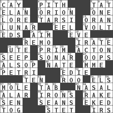 ACROSS 1. Island 4. Heart or essence 8. Make lace 11. Liveliness 13. Greek mythologigal hunter 15. Single 16. Old wives' tales, e.g. 17. Tarsus (plural) 18. NW Algerian seaport 19. Type of eclipse 21. Snakelike fish 22. Electrical Unit 23. Begley and Asner 24. Direct toward a target or goal 27. Night before a holiday 29. San ____ (Riviera town) 30. Feeling or showing extreme anger 34. Shoshoni 36. Demure 39. NE Massachussets city 40. Ooze 41. Underwater navigation system 43. I made a mistake 44. Columnist Joseph or Stewart 46. Nathan's nickname 47. Madame (abbr.) 48. _ dish (used to culture cells) 49. Singer Brickell 51. Nine, plus one 53. Friend of Pooh 54. Raised railways 57. Undercover agent 60. Bar bill 63. Relating to the nose 65. Having or resembling wings 66. Metal shackles 69. Libertine 70. Elected rep. 71. Seines 72. Supplemented with great effort 73. Coat; cloak 74. Proofreading order 75. Big collection agency DOWN 1. Cell (Danish) 2. Verbally 3. Tall tales 4. Plant holder 5. Lyricist Gershwin 6. Become fatigued 7. Flexible conduit 8. "Corrida" creature 9. Of or related to the anus 10. Portable shelter 12. Teachers' org. 14. The longest river in the world 18. Conquer 20. Actress Charlotte 25. Naughty children 26. Person of subnormal intelligence 28. By way of 29. Newsperson 31. Smallest unit of an element 32. Drink excessively 33. Followers of ems 34. Ubangi River tributary 35. Trial 37. _ tizzy (2 wds.) 38. Mother 40. Plant excrement 42. Redecorate 45. Sliced dessert 50. Electrically charged atom 52. Nuclear Threat Initiatives 54. 1973 Nobel Price Winner (Physics) Leo 55. Member of a famous L.A. basketball team 56. Bobsleighs 57. Vertical spar for supporting sails 58. Butter sub 59. Austrian-born American filmmaker Fritz 61. Ancient Greek god of war 62. Water vessel 64. "We ___ not amused" (Victoria) 67. Compass dir. 68. Fast jet (abbr.)