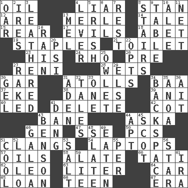 ACROSS 1. Lubricate 4. One who doesn't tell the truth 8. Comedian Laurel of Laurel & Hardy 12. "We ___ not amused" (Victoria) 13. Haggard of country music 14. Lie 15. Located in or toward the back 17. Vices 18. Collude with 19. Paper fasteners 21. Bathroom plumbing fixture 23. Part of HMS, perhaps 24. 17th letter of the Greek alphabet 26. Before (prefix) 27. Painter Guido (1575-1642) 28. Soaks 30. Slender fish 31. Ringlike coral islands and reefs 34. Sound made by sheep 37. Supplement with great effort 38. Natives or inhabitants of Denmark 39. Cuckoo 40. Directed 41. Erase 42. Small bed 43. Object of repulsion 44. "____ silly question..." 46. Commissioned military rank (abbr.) 47. Compass dir. 50. Personal Computers (abbr.) 51. Rings like a ship's bell 54. Portable computers 57. Lubricates 58. Having winglike extensions 60. Jacques of French films 62. Margarine 63. 61 cubic inches 64. 4-wheeled motor vehicle 65. Grant temporary use of 66. Adolescent 67. Epoch DOWN 1. Rowing implement 2. Angers 3. Tough but pliablecoriaceous 4. Crowbar 5. From or relating to Ireland 6. Everything 7. Repose 8. Flight of steps 9. Eating place 10. Toward shelter 11. Remaining after all deductions 13. Cartoonist voice _ Blanc 16. Precipitation 20. Air pressure measure (abbr.) 22. Elects 25. A small or young owl 27. Libertine 29. Otherwise 30. Set 31. An important port of Yemen 32. Falsehoods 33. Single 34. Keyboard key 35. Small Philippine buffalo 36. Small island 41. Mild oath, euphamism for damn 43. Gillaume's butler role 44. Fitting 45. Highlander 46. An organ shaped like a helmet 48. Schedule 49. Consumed 51. Calm and collected 52. _ and Stitch 53. Table seasoning 55. For each 56. Play the lead 59. Untruth 61. Retirement account (abbr.)