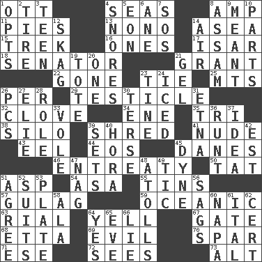 ACROSS 1. Baseball player Mel 4. Oceans 8. Electrical Unit 11. Sliced desserts 13. Words to Nanette 14. Toward the sea 15. Long journey 16. Washington bills 17. Austrian river, tributary to the Danube 18. Elected representative 21. Monetary aid 22. Went 23. Make a knot 25. Mountains (abbr.) 26. For each 29. A testis 32. Garlic unit 34. Compass dir. 35. Three (prefix) 38. Grain storage tower 39. Tear up 41. Unadorned 43. Snakelike fish 44. Greek goddess of the dawn 45. Natives or inhabitants of Denmark 46. Plea 50. Make lace 51. Cleo's killer 54. White ___ sheet 55. Airtight sealed metal containers 57. POW camp 59. Pertaining to the sea 63. Monetary unit of Yemen 64. Shout 67. Yard entry 68. Singer James 69. Tending to cause great harm 70. Practice fight 71. Compass dir. 72. Observes 73. Keyboard modifier key DOWN 1. Chooses 2. Hoop that covers a wheel 3. Adolescent 4. Sounds asleep 5. Period of immesurable duration 6. A saturated hydrocarbon 7. Distress signal 8. Indian state 9. Intended 10. Components 12. Heroin 14. Atmosphere 19. Lug 20. Single 21. Set 23. Prong on a fork 24. On the rocks 26. Personal Computers (abbr.) 27. Writer Wiesel 28. Hero or heavy, e.g. 30. Laconic 31. Inactive volcano in Sicily 33. Grand slam 36. The smallest animal of a litter 37. It may be bright or harebrained 39. Puts into a specified state 40. Israeli folk dance 42. Eastern Standard Time (abbr.) 45. Centimeter-gram-second unit of force 47. Tired old horse 48. Ringlike coral islands and reefs 49. Nervous spasm 51. Match 52. Sets or collections 53. Food holder 56. Settles 58. In the manner of 60. California wine valley 61. Slanted text style (abbr.) 62. Sure thing 64. It is so 65. First lady 66. Falsehood