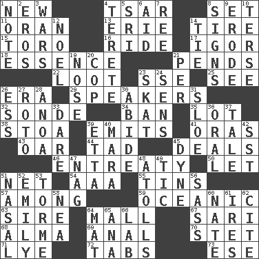 ACROSS 1. ___ Haven, CT 4. Russian ruler of old 8. Put into a specified state 11. Northwest Algerian city 13. 4th largest of the Great Lakes 14. Become fatigued 15. "Corrida" creature 16. Travel on or in a vehicle 17. Composer Stravinsky 18. Substance 21. Depends 22. Spoils 23. Compass dir. 25. Perceive with the eye 26. Epoch 29. Orators 32. Message 34. Bar 35. Car dealer's back yard 38. Portico 39. Gives off 41. Mouths or openings 43. Rowing implement 44. Small amount or degree 45. Allots cards 46. Plea 50. Allow 51. Fish or hair follower 54. American Automobile Association (abbr.) 55. Metal containers 57. Amid 59. Pertaining to the sea 63. Title for a man of rank and authority 64. Promenade 67. Indian skirt 68. _ mater 69. Of or related to the anus 70. Proofreading order 71. Potassium hydroxide 72. Bar bills 73. Compass dir. DOWN 1. Make mention of 2. Greek god of love 3. Armed conflicts 4. Cigar-shaped 5. _ Lanka 6. Assist 7. Portuguese money of account (variant) 8. Public displays of written messages 9. Wear away 10. Laconic 12. Christmas carol 14. Make a knot 19. Sense of smell 20. Police officer (slang) 21. For each 23. Three-handed card game 24. Elected reps. 26. Curvy letter 27. Printing process, for short 28. Small Philippine buffalo 30. Remain 31. _ gin 33. Have the gumption 36. Spoken 37. Lie 39. Singer James 40. Hindu Mythology: god of death 42. Fast jet (abbr.) 45. Unit of force 47. Tired old horse 48. Ringlike coral islands and reefs 49. Nervous spasm 51. Rhinal 52. Poet Dickinson 53. Singer Mel 56. Backtalk 58. Teachers' org. 60. Nathan's nickname 61. Angers 62. Quote 64. Floor protector 65. Santa ___, CA 66. Experiment locale