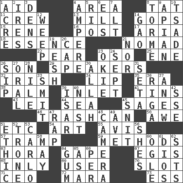 ACROSS 1. Help 4. Type of rug 8. Make lace 11. Ship's personnel 13. Place where flour is made 14. Republicans 15. French philosopher Descartes 16. Mail 17. Operatic vocal solo 18. Substance 21. Wanderer 22. Lightbulb-shaped fruit 23. Bear (Spanish) 25. Compass dir. 26. Male child 29. Orators 32. From or relating to Ireland 34. Mouth edge 35. Epoch 38. Inside of hand 39. An arm off of a larger body of water 41. Airtight sealed metal containers 43. Flowery wreath 44. Ocean 45. Gurus 46. File 13 50. Deep reverence 51. And so on (abbr.) 54. Tate display 55. Opinion 57. _____ steamer (cargo ship) 59. Modes 63. Israeli folk dance 64. Yawn 67. The front part of a cuirass 68. In an inward manner 69. One who makes use of a thing 70. Position in a hierarchy or organization 71. Corporate head (abbr.) 72. Hindu Mythology: god of death 73. Double-curved letter DOWN 1. Measure of real estate 2. Angers 3. Cub Scout units 4. Electrical Unit 5. _ de Janeiro 6. Raised railways 7. Keyboard modifier key 8. Singer Mel 9. Bee-related 10. Sadhe (variant) 12. Shed a tear 14. E Mali city 19. Delicate 20. Head covering 21. Not either 23. Migrant worker of the '30s 24. Back-to-school mo. 26. Small drink 27. Spoken 28. "Death on the ____" 30. Assad's deity 31. Bristle 33. Stricken, poetically 36. Capital of Latvia 37. Afresh 39. Austrian river, tributary to the Danube 40. A home for chicks 42. Compass dir. 45. In a ____ (agitated or irritated) 47. Strike 48. Device for capturing images 49. "___ Maria" 51. Value system 52. Heavy duty weighing machine 53. Monte _, Las Vegas Hotel/Casino 56. "______ My Girl" (Turtles hit) 58. Fifth month 60. Stare at amorously 61. "Vaya con ____" 62. Fast planes 64. Chewing product 65. White ___ sheet 66. For each