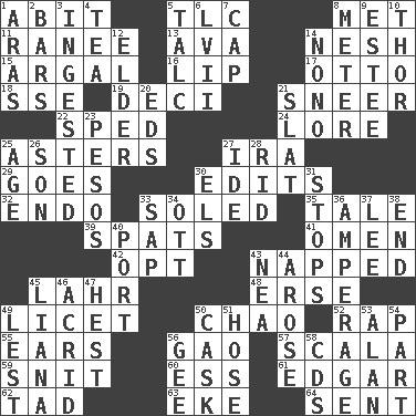 ACROSS 1. "This won't hurt ____!" 5. Affectionate concern, for short 8. Was introduced to 11. The wife of a rajah (variant) 13. Actress Gardner 14. Delicate 15. Therefore, facetiously 16. Mouth edge 17. "Beetle Bailey" pooch 18. Compass dir. 19. Tenth: prefix 21. Scornful expression 22. Broke a traffic law 24. Old wives' tales, e.g. 25. Michaelmas daisies 27. Retirement account (abbr.) 29. Moves 30. Proofreads 32. Inside; within (prefix) 33. Having a sole or soles 35. Lie 39. Arguments over trivial matters 41. Presage 42. Elect 43. Slept 45. Cowardly lion portrayer 48. Celtic language 49. It is permitted: Lat. 50. US Secretary of Labor Elaine L. _ 52. Hit sharply and swiftly 55. Hearing organs 56. E Mali city 57. Any of the three canals of the cochlea 59. In a ____ (agitated or irritated) 60. Double-curved letter 61. _ Allan Poe 62. Small amount or degree 63. Make supply last 64. Posted DOWN 1. Ancient river in northeast Turkey 2. Drinking establishments 3. Swallowed 4. Afternoon social gathering 5. Baby powder 6. 57 in ancient Rome 7. Head covering 8. Distance measurement 9. First name in cosmetics 10. Son of Odin 12. A person who is older than you are 14. Words to Nanette 20. Begley and Asner 21. Narrow board 23. Mexican monetary units 25. Ripen 26. Male child 27. Binary compound 28. To free from 30. Raised railways 31. Obstructs or blocks passage 33. Plant excrement 34. Baseball player Mel 36. Electrical Measurement 37. Area sheltered from the wind 38. Conclude 40. Sweet dark-red dessert wine 43. Teachers' org. 44. Came up 45. Climbing, woody, usually tropical vines 46. Sour-tasting 47. Command 49. For fear that 50. Keg 51. Stockings 53. Actor Alda or Thicke 54. Piece 56. Unit of force equal to gravity 58. Music discs