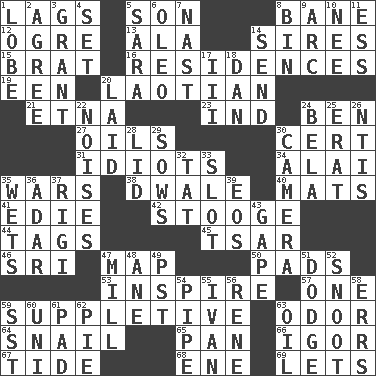 ACROSS 1. Fails to keep up a pace 5. Manchild 8. Object of repulsion 12. Legendary monster 13. Wing 14. Founders of families 15. Naughty child 16. Dwellings 19. Car or cant ending 20. Of or relating to Laos or its people 21. Inactive volcano in Sicily 23. Working for oneself (abbr.) 24. Benjamin's nick name 27. Lubricates 30. Certainty 31. Foolish or stupid persons 34. Jai ____ 35. Armed conflicts 38. A sleeping potion; an opiate (poet.) 40. Floor coverings 41. Singer Brickell 42. Moe Howard, for one 44. Labels 45. Russian ruler of old 46. _ Lanka 47. Atlas unit 50. Writing tablets 53. Motivate 57. Single 59. Supplementary 63. Scent 64. Slow-paced one 65. Baking dish 66. Russian composer Stravinsky 67. Periodic rise and fall of the sea level 68. Compass dir. 69. Allows DOWN 1. Ear part 2. Match 3. Let have 4. Put into a specified state 5. "Two Mules for Sister ____" 6. Margarine 7. Political cartoonist Thomas 8. Storage container 9. Curve 10. Born 11. Double-curved letter 14. Transmit 17. One more than two 18. Daniel's nick name 20. Put down 22. Annoying sounds 24. Actor Lugosi 25. Part of Q.E.F. 26. Nuclear Threat Initiatives 28. Flaplike covering 29. Sty mamas 30. Device for capturing images 32. Make lace 33. Groove 35. Soaks 36. The sixth month of the Jewish calendar 37. Swiss mountan, "Queen of the Mountains" 39. Greek goddess of the dawn 43. Open wide 47. Place where flour is made 48. One (Scot) 49. Pacific Standard Time (abbr.) 51. Evade 52. Snout, nose 54. Corncob 55. "Terrible" tsar 56. French philosopher Descartes 58. Blunders 59. Fast jet (abbr.) 60. University (slang) 61. Writing tablet 62. Sliced dessert 63. Lubricate