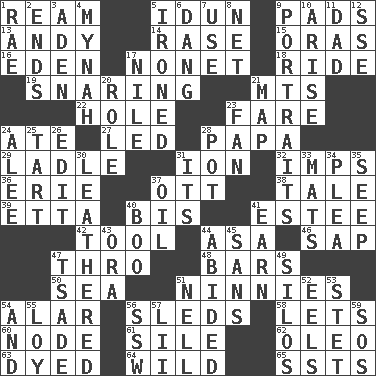 ACROSS 1. 480, 500 or 516 sheets of paper 5. Goddess of spring and wife of Bragi 9. Groovy apts. 13. Actor Griffith 14. To erase 15. Mouths or openings 16. Genesis locale 17. Music written for nine 18. Travel on or in a vehicle 19. Catching in a trap 21. Mountains (abbr.) 22. Hollow 23. Conductor's collection 24. Had dinner 27. Directed 28. Dad 29. Dipping utensil 31. Electrically charged atom 32. Naughty children 36. One of the Great Lakes 37. Baseball player Mel 38. Lie 39. Singer James 40. Again 41. First name in cosmetics 42. Implement 44. White ___ sheet 46. Plant excrement 47. Through, poetically 48. Soap units 50. Ocean 51. Simpletons 54. Having or resembling wings 56. Bobsleighs 58. Allows 60. Thickened enlargement 61. Drop; flow; fall 62. Margarine 63. Colored 64. Uncontrolled 65. Fast planes DOWN 1. Actress Charlotte 2. Extremities 3. Arabian gulf 4. Non-adult bird? 5. Pressed 6. Mild oath, euphamism for damn 7. Purpose 8. Fish or hair follower 9. Likenesses of persons 10. Get up 11. Male parent 12. Compass dir. 17. Mediterranean tributary 20. Hero or heavy, e.g. 21. Atlas unit 23. Air blower 24. Toward shelter 25. Small pie 26. Prepare for publication 28. Plant holder 30. Tough but pliablecoriaceous 31. ___ a Wonderful Life 33. Floor protectors 34. Entreaty 35. Ooze 37. Lubricate 40. Sometimes accompanies a hiss 41. Merit 43. Mouth or opening 44. Tolerated 45. Without 47. Sadhe (variant) 49. Grain storage towers 51. 1994 drama film starring Jodie Foster 52. Snakelike fish 53. Proofreading order 54. Added to 55. Myrna of the movies 56. Compass dir. 57. Cards in a Roman deck? 59. Distress signal