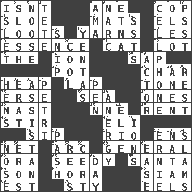 ACROSS 1. Is not 5. A saturated hydrocarbon 8. Police officer (slang) 11. _ gin 12. Floor coverings 14. Raised railways 15. Plunders 17. Entertaining tales 18. French article 19. Core 21. Feline 22. Car dealer's back yard 23. Definite Article 24. Electrically charged atom 25. Plant excrement 27. Cooking vessel 28. Burn to charcoal 31. Pile 35. Pet locale 37. Heavy book 38. Celtic language 39. Ocean 41. Singles 42. Vertical spar for supporting sails 43. Compass dir. 45. Monthly bill 46. Tumult 47. Connecticut Ivy Leaguer 49. Small drink 51. River (Sp.) 52. Followers of ems 55. Fish or hair follower 57. Curve 60. Commissioned military rank 62. Mouth or opening 63. Morally degraded 65. Before Barbara or Clara 66. Manchild 67. Israeli folk dance 68. Thailand, formerly 69. Eastern Standard Time (abbr.) 70. Filthy place 71. Snakelike fish DOWN 1. Small island 2. Splash clumsily 3. Trap for birds or small mammals 4. False hair 5. Nanny (var.) 6. Drug cop 7. Inactive volcano in Sicily 8. Portable communications device 9. Butter sub 10. Inconspicuous attention getter 13. Fast planes 16. Clip 17. Gossips 20. Calm and collected 26. Thespian 29. So be it 30. Repose 31. Is hesitant and indecisive 32. Part of Q.E.F. 33. Aide 34. _ dish (used to culture cells) 36. Animal enclosure 40. Disorder of the immune system 44. Writer Wiesel 48. Charged particles 50. Romantic infatuation 52. Bert's buddy 53. Relating to or accompanying birth 54. Shuts with force 55. Olfactory organ 56. Greek god of love 58. Vintage cars 59. Sure thing 61. Comfort 64. 24 hours