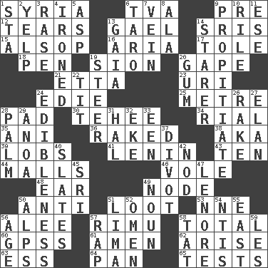 ACROSS 1. Damascus' land 6. Federal power corp. 9. Before (prefix) 12. Separates forcefully 13. Highlander 14. Indian titles of respect 15. Columnist Joseph or Stewart 16. Operatic vocal solo 17. Lacquered or enameled metalware 18. Animal enclosure 19. The Jewish people; Israel 20. Stare wonderingly 21. Singer James 23. RI univ. 24. Singer Brickell 25. Distance measurement (Brit.) 28. Writing tablet 30. Giggle 34. Monetary unit of Yemen 35. Black tropical American cuckoo 36. Moved through 38. Alias (abbr.) 39. Tennis shots 41. Soviet premier 1918-24 43. "___ Little Indians" 44. Promenades 46. Short-tailed, large-bodied rat 48. Ewer handle 49. Connecting point 50. Opposed to 51. Plunder 53. Compass dir. 56. Toward shelter 57. Tall New Zealand timber tree 58. Add up to 60. Global Positioning Systems (abbr.) 61. So be it 62. Get up 63. Double-curved letter 64. Baking dish 65. Trials DOWN 1. R.R. building 2. Sharp bark 3. To erase 4. Pressed 5. Cleo's killer 6. Edible starchy tuberous root 7. Distinctive style or manner 8. Chicken ___ king 9. Conciliate 10. Cause heat under the collar 11. Compass dir. 13. Greek goddess of the earth (variant) 14. A viewer who gazes fixedly 19. Navigate 20. Chewing product 22. Teat (slang) 24. The property of being fit to eat 26. Libertine 27. Style 28. Inside of hand 29. Small Philippine buffalo 31. Actor Linden 32. Make supply last 33. Car or cant ending 37. A piece of turf (Scot.) 40. Chalkboards 42. Allow head to fall sleepily 45. _ Lanka 47. Poe poem 49. Part of speech 50. High mountains 51. Pale green bean 52. Sign of something about to happen 54. Nuclear Threat Initiatives 55. 90 degrees 56. Ripen 57. Strike 58. Make lace 59. French article