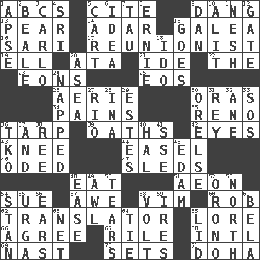 ACROSS 1. Lettered men learn these first 5. Quote 9. Mild oath, euphamism for damn 13. Lightbulb-shaped fruit 14. The sixth month of the Jewish calendar 15. An organ shaped like a helmet 16. Indian skirt 17. One who advocates reunion 19. Pipe bend 20. _ moment's notice (2 wds.) 21. Binary compound 22. Definite Article 23. Immeasurably long periods of time 25. Greek goddess of the dawn 26. Nest on high 30. Mouths or openings 34. Aches 35. Former U.S. Attorney General Janet 36. Canvas cover 39. Profane or obscene expressions 42. Snake ____ (dice throw) 43. Leg joint 44. Artist's stand 46. Wrote a lyric poem 47. Bobsleighs 48. Erode 51. A really long time 54. Institute legal proceedings 57. Deep reverence 58. Zeal 60. Director Reiner 62. Interpreter 65. Old wives' tales, e.g. 66. Match 67. Cause heat under the collar 68. International (abbr.) 69. Political cartoonist Thomas 70. Arranges properly for use 71. Capital of the state of Qatar DOWN 1. Domed church section 2. Calif. Air Force Base 3. Monte _, Las Vegas Hotel/Casino 4. Indian title of respect (Mr.) 5. Draw slowly or heavily 6. The main thing one is thinking about 7. The 19th letter of the Greek alphabet 8. Bert's buddy 9. Daniel's nick name 10. Set down 11. Soft 12. Yard entry 15. Travels 18. Wedding promise 20. At sea 24. Slept 27. _ de Janeiro 28. _ tizzy (2 wds.) 29. _____ Park, CO 30. Threatening words 31. Marina Del _, California 32. A saturated hydrocarbon 33. Distress signal 36. Ring climax 37. Added to 38. Portuguese money of account (variant) 40. Actor Linden 41. Compass dir. 45. Dutch treat 48. Relaxation 49. Leather borer 50. Separates forcefully 52. U. of Maine site 53. 0 degrees 54. Comedian Laurel of Laurel & Hardy 55. Capital and largest city of Mongolia 56. Hearing organs 58. Electrical Unit 59. Angers 61. Actor Lugosi 63. Fish or hair follower 64. Make a knot 65. Flaplike covering