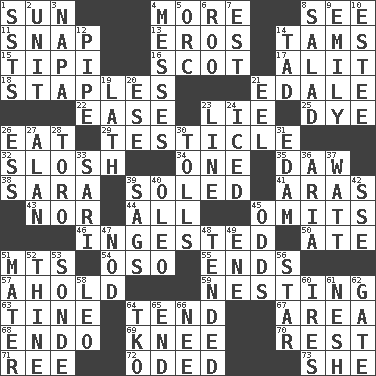 ACROSS 1. Player for Phoenix 4. Greater amount 8. Observe 11. Fastener 13. Greek god of love 14. Scottish caps 15. Native american tent (variation) 16. Highlander 17. Came down and settled, as after flight 18. Paper fasteners 21. Peak District village in England 22. Relaxation 23. Untruth 25. Color 26. Erode 29. One of the two male reproductive glands 32. Make a splashing sound 34. Single 35. Fool 38. "Two Mules for Sister ____" 39. Having a sole or soles 41. Ancient river in northeast Turkey 43. Or not 44. 100% 45. Leaves out 46. Eaten 50. Had dinner 51. Mountains (abbr.) 54. Bear (Spanish) 55. Extremities 57. Hold, grip (Informal) 59. Snuggling 63. Prong on a fork 64. Be inclined (to) 67. Type of rug 68. Inside; within (prefix) 69. Leg joint 70. Respite 71. To separate or throw off 72. Wrote a lyric poem 73. A female animal or person DOWN 1. Fast planes 2. A single undivided whole 3. California wine valley 4. Makes clutter 5. The grampus (Milton) 6. Friend of Pooh 7. Eastern Standard Time (abbr.) 8. Vegetable dish 9. Poet Dickinson 10. First name in cosmetics 12. Corncob 14. Small boy 19. Thin strip of wood or metal 20. Compass dir. 21. Snakelike fish 23. Actor's bit 24. On the rocks 26. Double-curved letter 27. Actor Alda or Thicke 28. "Corrida" creature 30. For Whom the Bell _____ 31. Dutch treat 33. Indian skirt 36. Operatic vocal solo 37. Electrical Unit 39. Settles 40. Butter sub 42. Compass dir. 45. Likelihood 47. Lower and raise head in agreement 48. Looked after 49. Compass dir. 51. Mother 52. One or ones belonging to thee 53. Something which is sent 56. Play the lead 58. Lion 60. Angers 61. Tender 62. Yard entry 64. Ring climax 65. Conclude 66. Born
