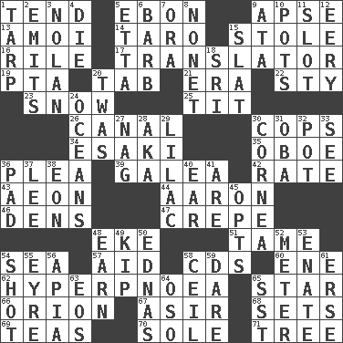ACROSS 1. Be inclined (to) 5. Inky black, to poets 9. Domed church section 13. Mine, in Marseilles 14. Edible starchy tuberous root 15. Fur scarf 16. Cause heat under the collar 17. Interpreter 19. Parent Teacher Association (abbr.) 20. Bar bill 21. Epoch 22. Filthy place 23. Overwhelm 25. Teat (slang) 26. Lessep's creation 30. 911 reaches them 34. 1973 Nobel Price Winner (Physics) Leo 35. Mitch Miller's instrument 36. Entreaty 39. An organ shaped like a helmet 42. Assign a rank or rating to 43. Period of immesurable duration 44. Composer Copland 46. Habitations of wild animals 47. Streamer paper 48. Supplement with great effort 51. Docile 54. Ocean 57. Assist 58. Music discs 60. Compass dir. 62. Abnormally rapid or deep breathing 65. Play the lead 66. Greek mythologigal hunter 67. SW Saudi Arabia district 68. Arranges properly for use 69. Afternoon social gatherings 70. Flatfish 71. Woody plant DOWN 1. Canvas cover 2. Sends forth 3. Pitcher Ryan 4. Pass on 5. Singer James 6. Sharp remark 7. Mouth or opening 8. Music written for nine 9. _ moment's notice (2 wds.) 10. Plant holders 11. Position in a hierarchy or organization 12. Suggestive of the supernatural 15. Narrow board 18. Indian title of respect (Mr.) 20. It was, poetically 24. Seas 27. Tired old horse 28. Alias (abbr.) 29. Pale purple color 30. Pupil covering 31. Chief or king in Benin or Nigeria 32. Plant holder 33. Perceive with the eye 36. Writing tablet 37. Area sheltered from the wind 38. Age 40. Hearing organ 41. "We ___ not amused" (Victoria) 45. Chooses 48. Merit 49. Sleep 50. Ferber et al. 52. Distance measurement 53. Related on the mother's side 54. Opportunity 55. Jane of fiction 56. Capital of Western Samoa 58. To provide with a ceiling 59. Have the gumption 61. Celtic language 63. Greek goddess of the dawn 64. Bear (Spanish) 65. Fast jet (abbr.)