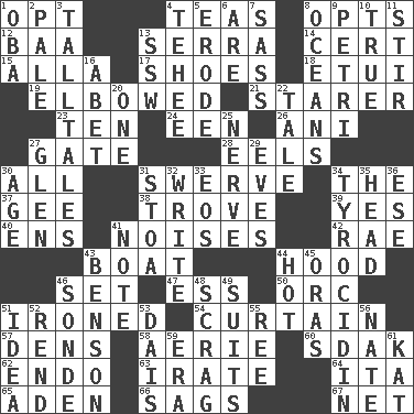 ACROSS 1. Choose 4. Beverages made from leaves 8. Chooses 12. Sound made by sheep 13. Father Junipero _ 14. Certainty 15. Silent film actress Nazimova 17. Imelda's hoard 18. Needle case 19. Turned at an angle; bent 21. A viewer who gazes fixedly 23. Nine, plus one 24. Car or cant ending 26. Cuckoo 27. Yard entry 28. Snakelike fish 30. Everything 31. Turn aside suddenly 34. Definite Article 37. Unit of force equal to gravity 38. Collection of objects 39. Consenting reply 40. Followers of ems 41. Annoying sounds 42. Actress Charlotte 43. Water vessel 44. Parka part 46. Put into a specified state 47. Curvy letter 50. The grampus (Milton) 51. Pressed 54. Window treatment 57. Habitations of wild animals 58. Nest on high 60. Neighbor of Neb. 62. Inside; within (prefix) 63. Feeling or showing extreme anger 64. Call ___ day 65. An important port of Yemen 66. Droops 67. Fish or hair follower DOWN 1. Chief or king in Benin or Nigeria 2. Diluted with white 3. Baron Munchausen's specialties 4. Giggle 5. Wear away 6. "We ___ not amused" (Victoria) 7. Backtalk 8. Seas 9. _ dish (used to culture cells) 10. Loyal 11. Disorderly outburst 13. Compass dir. 16. Collude with 20. Single 22. Falsehood 25. Effrontery 27. Small, secluded valley 29. Nights before holidays 30. Personal question 31. Portico 32. Compose 33. Greek goddess of the dawn 34. Polypeptide antibiotic 35. Froth on beer 36. Compass dir. 41. Short letter 43. Gillaume's butler role 44. Being at a high temperature 45. Mouths or openings 46. Something which is sent 48. Lean end of the neck 49. Sets or collections 51. The content of cognition 52. Tear apart 53. Raised platform 55. To separate or throw off 56. Nathan's nickname 59. Period 61. Krazy ___ of comics