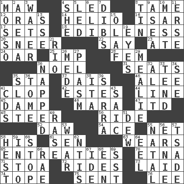 ACROSS 1. Informal term for the mouth 4. Downhill vehicle 8. Docile 12. Mouths or openings 14. Sun: prefix 16. Austrian river, tributary to the Danube 17. Puts into a specified state 18. The property of being fit to eat 20. Contemptuous expression 22. Declare 23. Had dinner 24. Rowing implement 25. Mischievous child 28. Opposite of masc. 30. Christmas carol 31. Theater features 35. R.R. building 37. Raised platform 40. Toward shelter 41. Hoof sound 42. _____ Park, CO 44. Actor's bit 45. Moist 46. Hindu Mythology: god of death 47. It would 48. Navigate 50. Travel on an animal 52. Simpleton 54. Adept person 55. Fish or hair follower 58. Part of HMS, perhaps 61. Elected rep. 63. Puts on (as clothing) 65. Pleas 70. Inactive volcano in Sicily 71. Portico 72. Amusement-park features 73. Put down 74. Drink excessively 75. Transmitted 76. Area sheltered from the wind DOWN 1. With motion or animation 2. Sports stadium 3. Wetness 4. A female animal or person 5. Directed 6. Connecticut Ivy Leaguer 7. Claim 8. Shallow baking pan 9. At sea 10. Vertical spar for supporting sails 11. Celtic language 13. Compass dir. 15. Norwegian king 19. Snake ____ (dice throw) 21. River (Sp.) 26. Ancient Persian 27. Suffix with ecto or cyto 29. Ear of corn 30. Slept 32. Set down 33. Watch over 34. Perceive with the eye 35. Narrow board 36. Heavy book 38. Call ___ day 39. Spanish missionary in California 41. Music discs 43. Ketch in the Levant 49. Raze (variant) 51. Morning condensation 53. Erode 55. Relating to or accompanying birth 56. Bert's buddy 57. Sadhe (variant) 58. Command 59. To the inside or interior of 60. Discontinue 62. Nuclear Threat Initiatives 64. Snakelike fish 66. Actress Charlotte 67. Binary compound 68. Car or cant ending 69. Fast jet (abbr.)