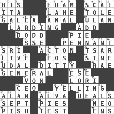 ACROSS 1. Altar cloth linen 4. Dutch treat 8. Scram! 12. Call ___ day 13. Unable to walk 14. Lacquered or enameled metalware 15. An organ shaped like a helmet 18. Of or related to the anus 19. ____ Bator 20. Preparing or cooking with lard 22. Increase 23. Texas town _ City 24. Sliced dessert 25. Compass dir. 26. Pre-World Series prize 30. _ Lanka 33. Gambison 36. Russian ruler of old 37. Moving, as bait 39. Greek goddess of the dawn 40. Trig term 41. Hereditary estate 42. Simple song 44. Actress Charlotte 45. Commissioned military rank 47. Compass dir. 50. Promise 51. Australian parrot (variant) 53. Corporate head (abbr.) 54. Crying or shouting loudly 57. Actor Alda or Thicke 59. Inventor's middle name 61. Allots cards 63. Back-to-school mo. 64. Sliced desserts 65. Modern: prefix 66. Expression of disdain 67. Trial 68. Followers of ems DOWN 1. Of large size 2. Slanted text style (abbr.) 3. Vegetable dish 4. Liveliness 5. Mild oath, euphamism for damn 6. Nanny (var.) 7. Cartoonist voice _ Blanc 8. SAT takers 9. Chilled 10. Wing 11. Nine, plus one 16. Greek god of love 17. Does sums 21. The content of cognition 22. The 18th letter of the Arabic alphabet 24. Fenced enclosure 26. Mail 27. SW Saudi Arabia district 28. Grandmother 29. Relationship diagram 30. Snaillike creature with no shell 31. Travel on an animal 32. _ the terrible 34. To provide with a ceiling 35. Small child 38. Veterans Day date 42. Fool 43. Shout 46. Friend of Pooh 48. Exchanged or delivered for money 49. One of the Great Lakes 52. Lacking in sense or substance 53. Balmoral and tarboosh 54. Jacques Cousteau's middle name 55. Compass direction 56. Small, secluded valley 57. Viper 58. Flowery wreath 59. Fitting 60. Whopper 62. Distress signal