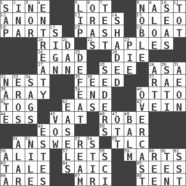 ACROSS 1. Trig term 5. Car dealer's back yard 8. Political cartoonist Thomas 12. Soon (poet.) 13. Angers 15. Butter sub 16. Components 18. Romantic infatuation 19. Water vessel 20. To free from 22. Paper fasteners 24. Mild oath 26. Pass on 27. Queen of England 1702-14 28. Observe 29. White ___ sheet 32. Egg locale 35. Nourish 37. Actress Charlotte 38. Like ___ of sunshine 39. Conclude 40. Von Bismarck 41. Coat; cloak 42. Comfort 43. Distinctive style or manner 44. Curvy letter 45. Large container 46. Loose flowing garment 49. Greek goddess of the dawn 50. Play the lead 51. Replies 55. Affectionate concern, for short 56. Came down and settled, as after flight 57. Allows 59. Shops 63. Falsehood 64. Ketch in the Levant 65. Perceives with the eye 66. Ancient Greek god of war 67. Medical imaging device (abbr.) 68. Portable shelter DOWN 1. Plant excrement 2. _ tizzy (2 wds.) 3. Not either 4. Plea 5. Mouth edge 6. Mouths or openings 7. Trial 8. Having high moral qualities 9. _ vera 10. Oceans 11. Small child 14. Cast a shadow over 17. Public display of a written message 21. Daniel's nick name 23. Sliced dessert 25. Outscore 28. Spring feasts 29. Johnson of "Laugh-In" 30. Suttee (variant) 31. A really long time 32. Nathan's nickname 33. Greek god of love 34. Sinks 36. Followers of ems 40. Cloudy 42. Artist's stands 45. Solemn pledge 47. Baseball player Mel 48. Lip ointment 49. _____ Park, CO 51. Having or resembling wings 52. Mediterranean tributary 53. 480, 500 or 516 sheets of paper 54. Agitate 56. _ moment's notice (2 wds.) 58. _-fi 60. To riddle 61. Nine, plus one 62. Fast jet (abbr.)