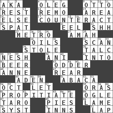 ACROSS 1. Alias (abbr.) 4. Cassini of fashion 8. Von Bismarck 12. Repose 14. San ____ (Riviera town) 15. Type of rug 16. Otherwise 17. Neutralize 20. Argument over a trivial matter 21. Snakelike fish 22. Quiet! 23. Paris' subway 27. Nanny 29. Petroleums 31. Examine hastily 34. Fur scarf 35. Baby powder 36. Delicate 39. Cuckoo 41. To the inside or interior of 42. Fermented drink made from hops 43. More peculiar 46. Queen of England 1702-14 47. Rump 48. Arabian gulf 51. Phillipine bananalike plant 54. Sep. follower 56. Allow 58. Mouths or openings 61. Conciliate 66. Stare 67. Edible starchy tuberous root 68. Sliced desserts 69. Unable to walk 70. System (abbr.) 71. Restaurants 72. Pet locale DOWN 1. Ancient Greek god of war 2. Seaweed 3. Indian state 4. The grampus (Milton) 5. Lion 6. Australian flightless bird 7. Went 8. Rowing implement 9. File 13 10. Technology 11. Pledge 13. False hair 18. Beverage made from leaves 19. Shade tree 24. Small child 25. River (Sp.) 26. Water jar 28. Moving about 30. Sir (Sp.) 32. The first octave above the treble staff 33. Non-commissioned officer (abbr.) 34. Fragment 36. Basketball assoc. 37. Car or cant ending 38. Elected representatives 40. The content of cognition 44. Apply (a substance) by light strokes 45. Epoch 49. Connecticut Ivy Leaguer 50. Fish or hair follower 52. Calm and collected 53. Therefore, facetiously 54. Elects 55. Supercomputer manufacturer 57. Native american tent (variation) 59. _ mater 60. Ooze 62. Cooking vessel 63. The 18th letter of the Arabic alphabet 64. Nine, plus one 65. Curvy letter