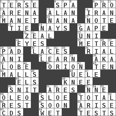 ACROSS 1. Laconic 6. Health resort 9. Adept person 12. Sports stadium 13. ____ Jay Lerner 14. SW Asia republic 15. French painter Edouard 16. Nanny 17. Make mention of 18. Standoff 19. Negative votes 20. Yawn 21. Ardor 23. University (slang) 24. Sight organs 25. Distance measurement (Brit.) 28. Groovy apt. 30. Shoestrings 34. Monetary unit of Yemen 35. Black tropical American cuckoo 36. Acquire or gain knowledge or skills 38. Alias (abbr.) 39. Ear part 41. Greek mythologigal hunter 43. Nine, plus one 44. Promenades 46. Ubangi River tributary 48. Raised railways 49. Leg joint 50. In a ____ (agitated or irritated) 51. Ancient Greek god of war 53. Compass dir. 56. Butter sub 57. A type of plum 58. Add up to 60. Repose 61. Within a short period 62. Get up 63. Music discs 64. Soggy 65. Trials DOWN 1. Scottish cap 2. Part of Q.E.F. 3. Painter Guido (1575-1642) 4. Dwarf with a sinus problem 5. Erode 6. Kill 7. Zero-star reviews 8. Santa ___, CA 9. Conciliate 10. Assign a rank or rating to 11. Single 13. Of or related to the anus 14. More lacking in sense or substance 19. Relating to the nose 20. Chewing product 22. Snakelike fish 24. The property of being fit to eat 26. Immoral or dissolute person 27. Enthusiasm 28. Inside of hand 29. Small Philippine buffalo 31. Corporate head (abbr.) 32. Ewer handle 33. Indian title of respect (Mr.) 37. Parts of speech 40. American author Paul (1891-1958) 42. Born 45. Fast jet (abbr.) 47. Poe poem 49. Peachy ____! 50. Downhill vehicle 51. _ vera 52. Carrot, for example 54. Nuclear Threat Initiatives 55. 90 degrees 56. The grampus (Milton) 57. Compass dir. 58. Make lace 59. French article