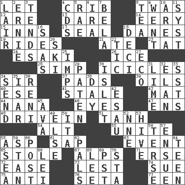 ACROSS 1. Allow 4. Baby bed with high sides 8. It was, poetically 12. "We ___ not amused" (Victoria) 13. Have the gumption 14. Suggestive of the supernatural 15. Taverns 17. Lick closed 18. Natives or inhabitants of Denmark 19. Amusement-park features 21. Had dinner 23. Make lace 24. 1973 Nobel Price Winner (Physics) Leo 26. Frozen water 28. Simple or foolish person 30. Winter's stalactites 34. Title for a knight 37. Groovy apts. 39. Lubricates 40. Compass dir. 41. Having lost freshness 43. Floor covering 44. Nanny 46. Sight organs 47. Followers of ems 48. Popular '50s hangout 51. Hyperbolic tangent 54. Keyboard modifier key 55. Join together 58. Viper 61. Plant excrement 63. Incident 65. Took without asking 67. High mountains 71. Celtic language 72. Relaxation 73. For fear that 74. Institute legal proceedings 75. Against 76. Stalk of a moss capsule 77. Car or cant ending DOWN 1. Den 2. Bert's buddy 3. Is inclined (to) 4. Music discs 5. Actress Charlotte 6. Retirement account (abbr.) 7. Actor Lugosi 8. Afternoon social gathering 9. Left 10. Type of rug 11. System (abbr.) 16. Oceans 18. Tenth: prefix 20. What Jean-Claude Killy likes to do 22. Nervous spasm 25. Naughty children 27. Environmental prefix 29. Eucharist need 30. Small island 31. Welles in "The Third Man" 32. Enthusiasm 33. Fast planes 34. Transmit 35. Austrian river, tributary to the Danube 36. Painter Guido (1575-1642) 38. 24 hours 42. Son of Isaac 45. Actress Gardner 49. Otherwise 50. Call ___ day 52. Compass dir. 53. Hub of activity 56. Laconic 57. Take place subsequently 58. Toward the sea 59. Comedian Laurel of Laurel & Hardy 60. Mail 62. Friends 64. Adolescent 66. Flowery wreath 68. Area sheltered from the wind 69. Pacific Standard Time (abbr.) 70. R.R. building