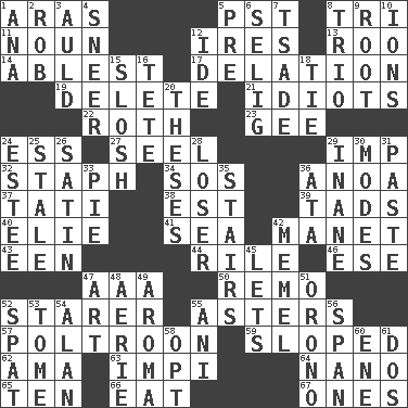 ACROSS 1. Ancient river in northeast Turkey 5. Pacific Standard Time (abbr.) 8. Three (prefix) 11. Part of speech 12. Angers 13. Friend of Pooh 14. Most capable 17. Accusation by an informer 19. Erase 21. Foolish or stupid persons 22. Writer of Portnoy's Complaint (1969) 23. Turn to the right 24. Double-curved letter 27. Sew up the eyelids of hawks and falcons 29. Mischievous child 32. Staphylococcus 34. Distress signal 36. Small Philippine buffalo 37. Jacques of French films 38. Eastern Standard Time (abbr.) 39. Small amounts or degrees 40. Writer Wiesel 41. Ocean 42. French painter Edouard 43. Car or cant ending 44. Cause heat under the collar 46. Compass dir. 47. American Automobile Association (abbr.) 50. San ____ (Riviera town) 52. A viewer who gazes fixedly 55. Michaelmas daisies 57. Coward 59. Had an oblique or slanted direction 62. Housemaid (var.) 63. Body of Kaffir warriors 64. Billionth: prefix 65. Nine, plus one 66. Consume 67. Singles DOWN 1. Santa ___, CA 2. Director Reiner 3. Old (Scot.) 4. Scornful expression 5. Before (prefix) 6. Former Milwaukee Brewers owner Bud 7. Sadhe (variant) 8. Musical group of three 9. Carrot, for example 10. Charged atoms 12. Binary compound 15. Splash clumsily 16. Wig 18. Neckwear 20. College papers 24. First name in cosmetics 25. Having lost freshness 26. Smooth fabric 28. Failure 29. Silly 30. Methods 31. Thick mixture 33. Sliced dessert 35. Flight of steps 36. "One Day ___ Time" 42. Klaipeda city 45. Allows 47. Nonscientific branch of learning 48. Nest on high 49. Scent 51. U. of Maine site 52. Argument over a trivial matter 53. Heavy book 54. Actor Alda or Thicke 55. Black tropical American cuckoo 56. Connect, as a bridge 58. Choose 60. Compass dir. 61. Two (Sp.)